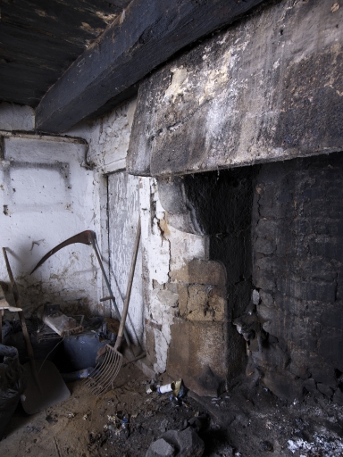 Logis médian, cheminée du rez-de-chaussée, détail de la console gaucheImmatriculation