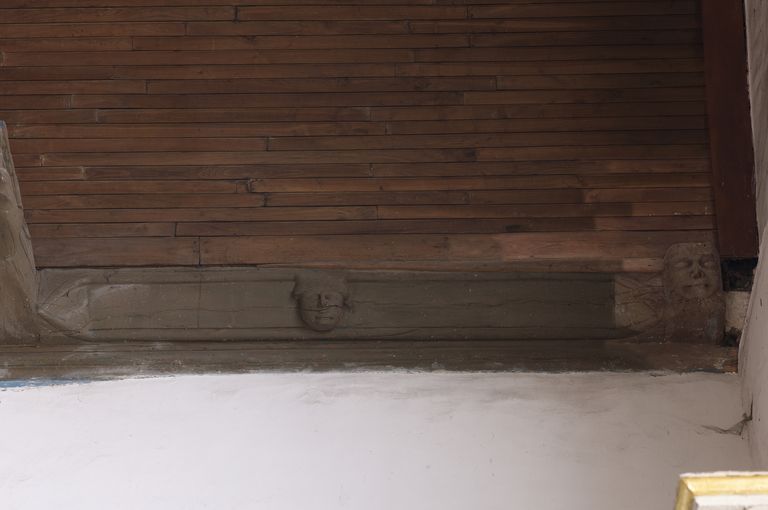 Chœur, mur nord, sablière : visage de femme (dont le nez a été probablement refait) et blochet (à droite) en forme de visage (état en 2011)Immatriculation