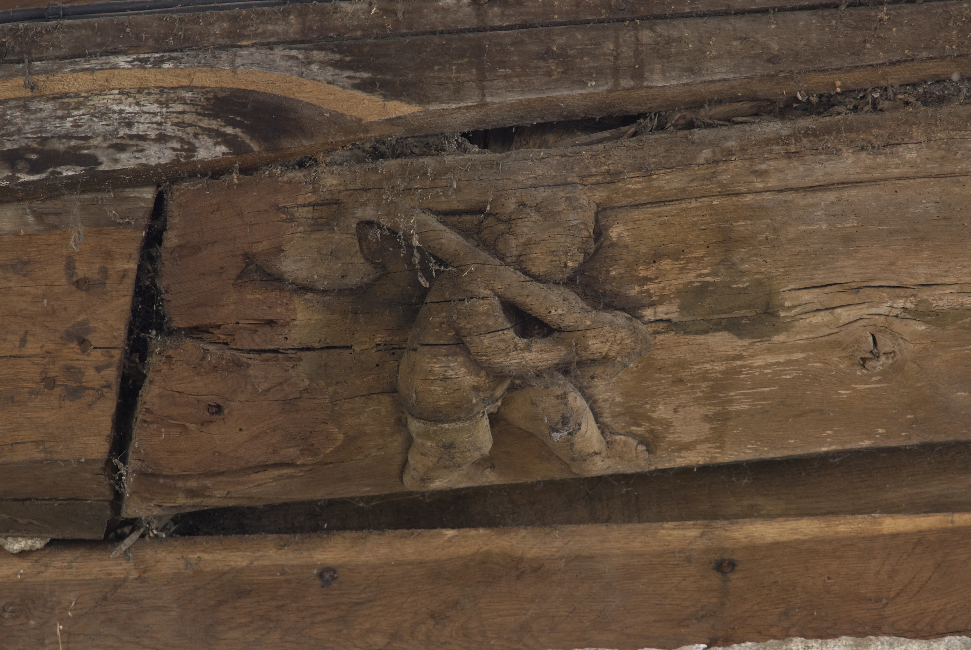 Nef, mur sud, sablière : homme portant un outil (une hache ?) sur l'épaule droite (état en 2012)Immatriculation