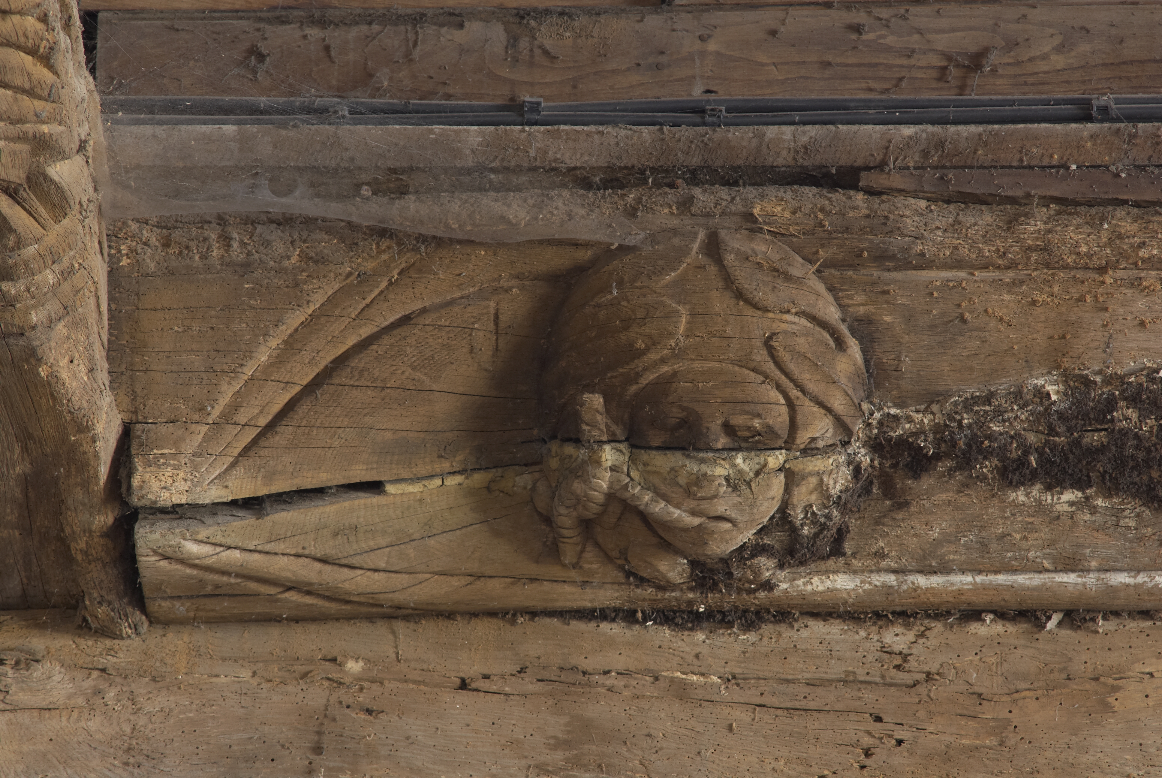 Nef, mur sud, sablière : tête de femme crachant une cordelette (état en 2012)Immatriculation
