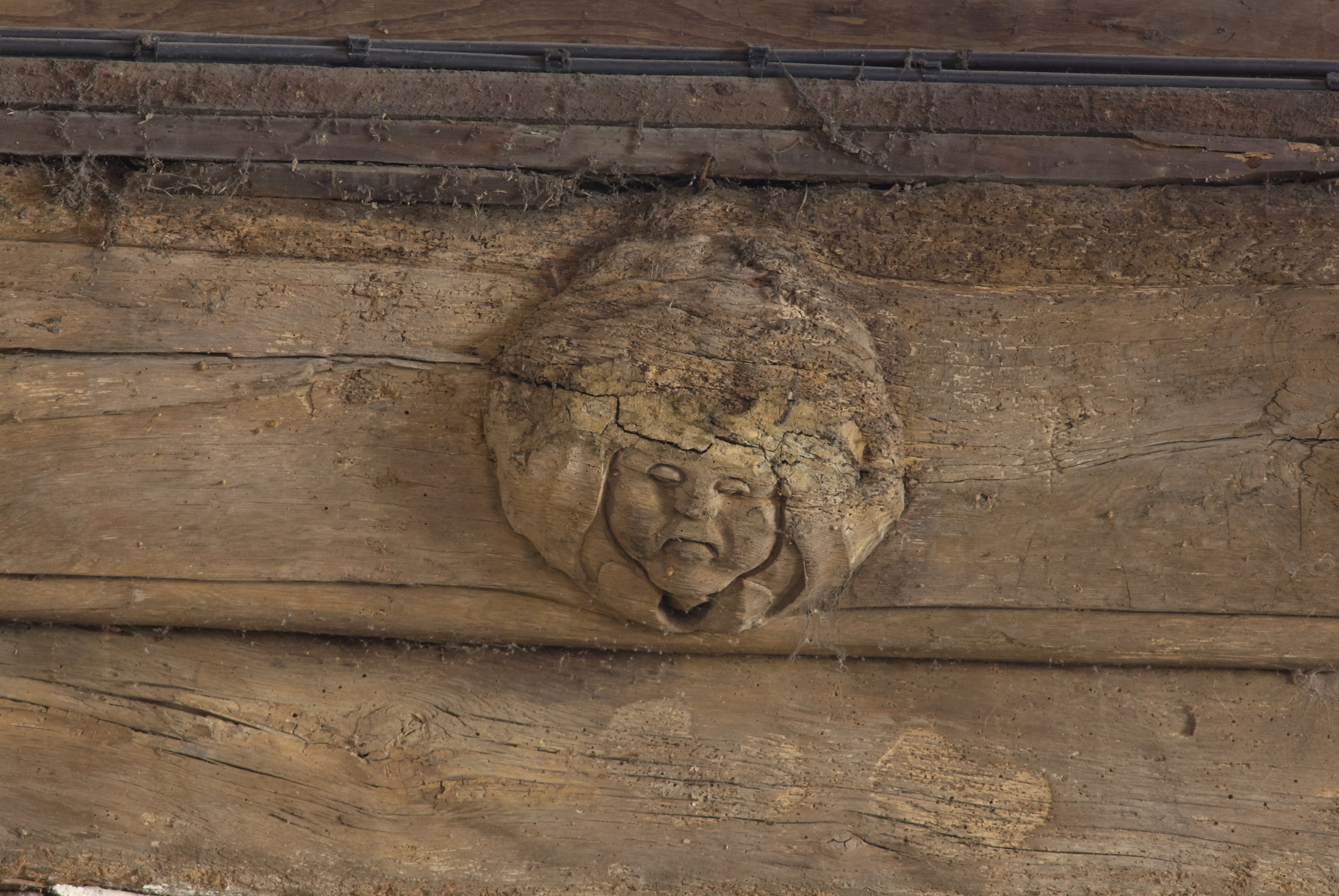 Nef, mur sud, sablière : tête d'homme (état en 2012)Immatriculation