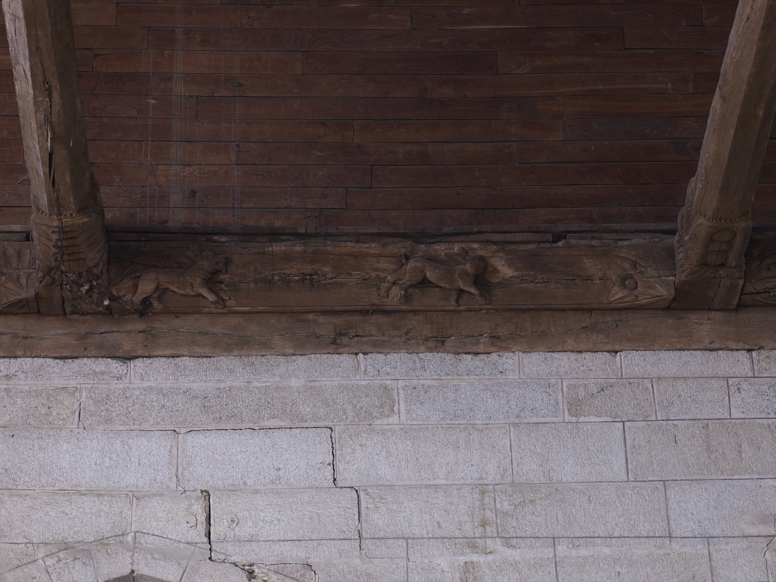 Nef, mur nord, sablière : chien courant après un lièvre (état en 2012)Immatriculation
