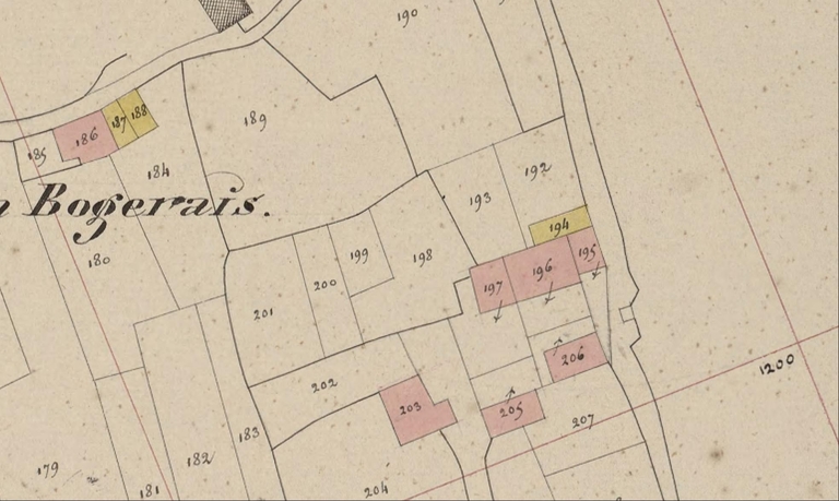 La ferme de la Bogerais sur le plan cadastral de 1840, section E, 3e feuille (A. D. Morbihan, 3 P 260/25)Immatriculation