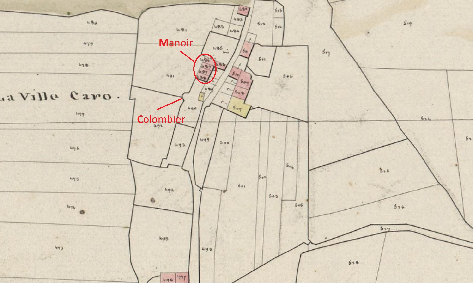 Le manoir de la Ville Caro sur le cadastre de 1824 (A. D. du Morbihan, 3 P 157/10)Immatriculation