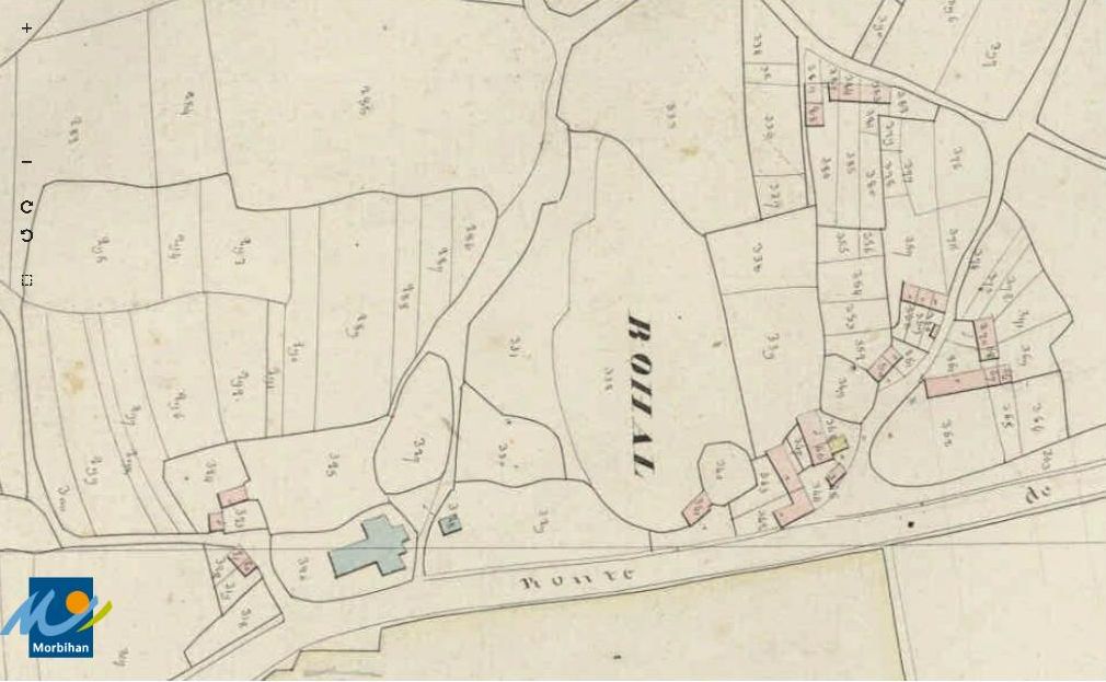 Le bourg de Bohal sur le cadastre de 1823 (A. D. du Morbihan, 3 P 60/4).Immatriculation