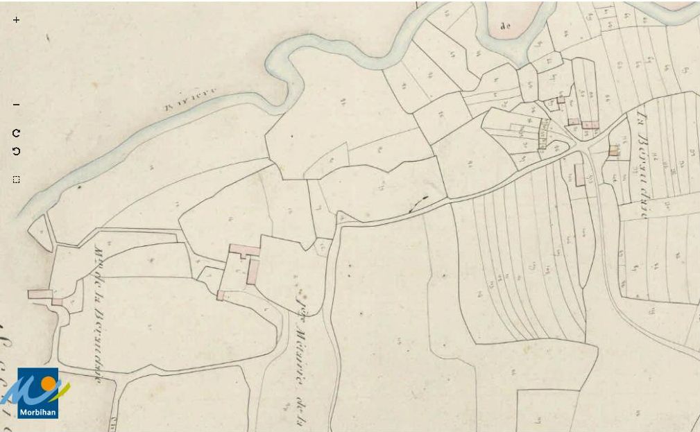 Le manoir, la métairie et le moulin de la Béraudaie sur le cadastre de 1823 (A. D. du Morbihan, 3 P 60/4)Immatriculation