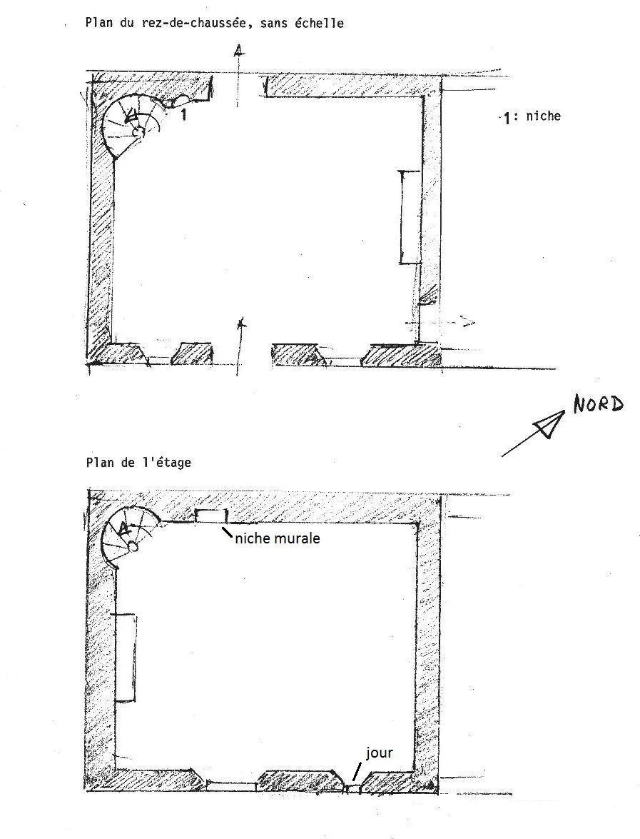 Maison 1 : plans au sol au rez-de-chaussée et à l'étage (schéma (réalisé en 1990 par J. P. Ducouret)Immatriculation