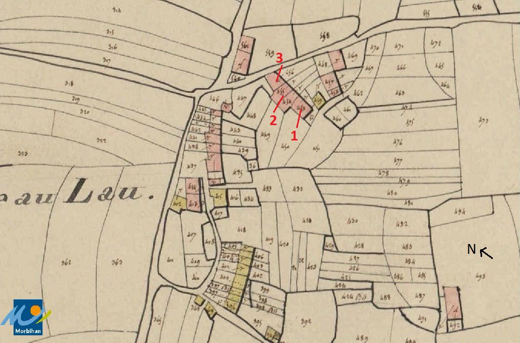 La maison 3 dans l'alignement de la Ville au Lau sur le cadastre de 1832 (A. D. Morbihan 3P 85/7)Immatriculation