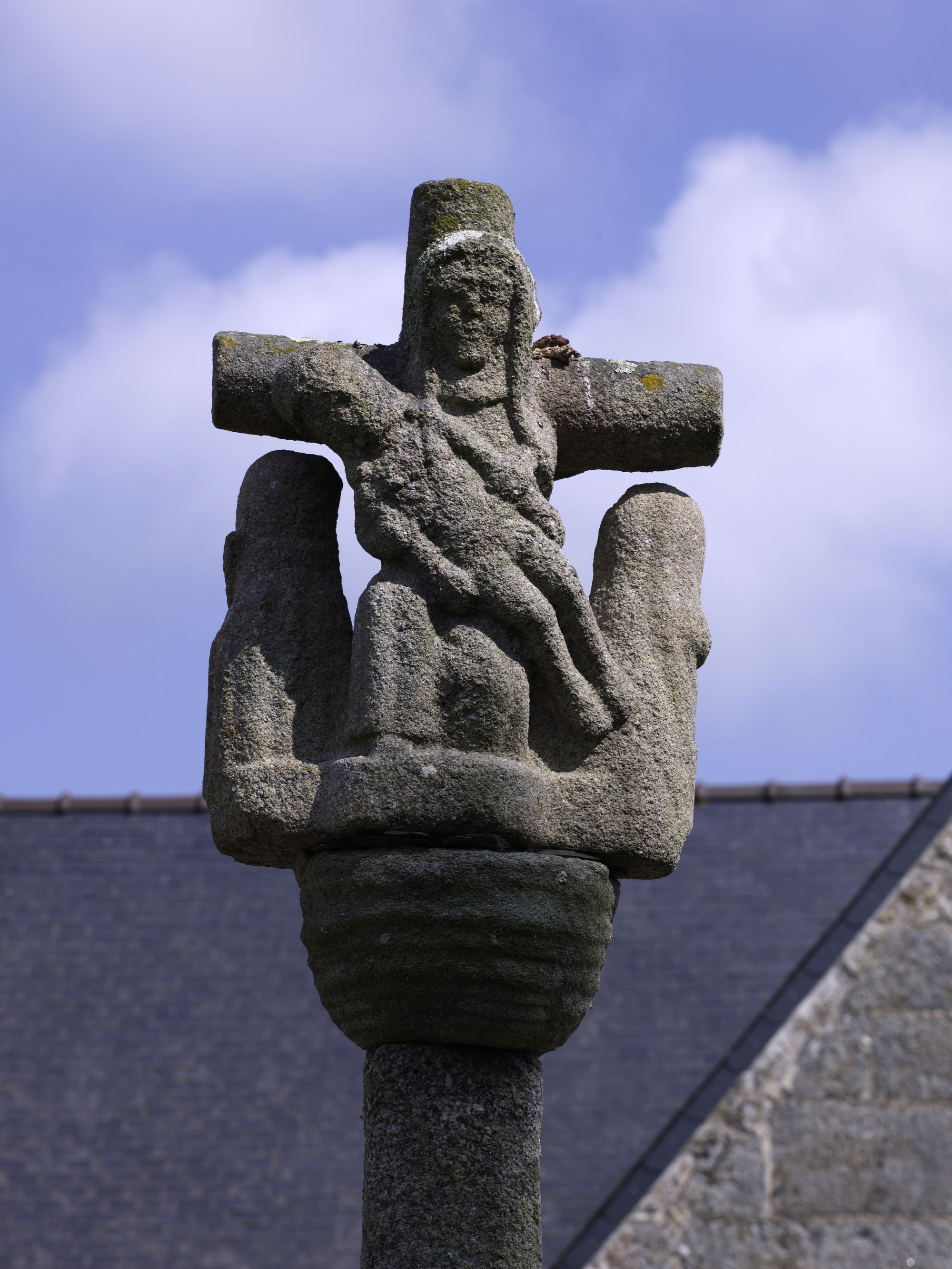 Caouënnec-Lanvézéac, Lanvézéac, cimetière de l'église paroissiale de Saint-Ezéchiel : calvaire (17e siècle), vers le sud, pietà ou Vierge de PitiéImmatriculation