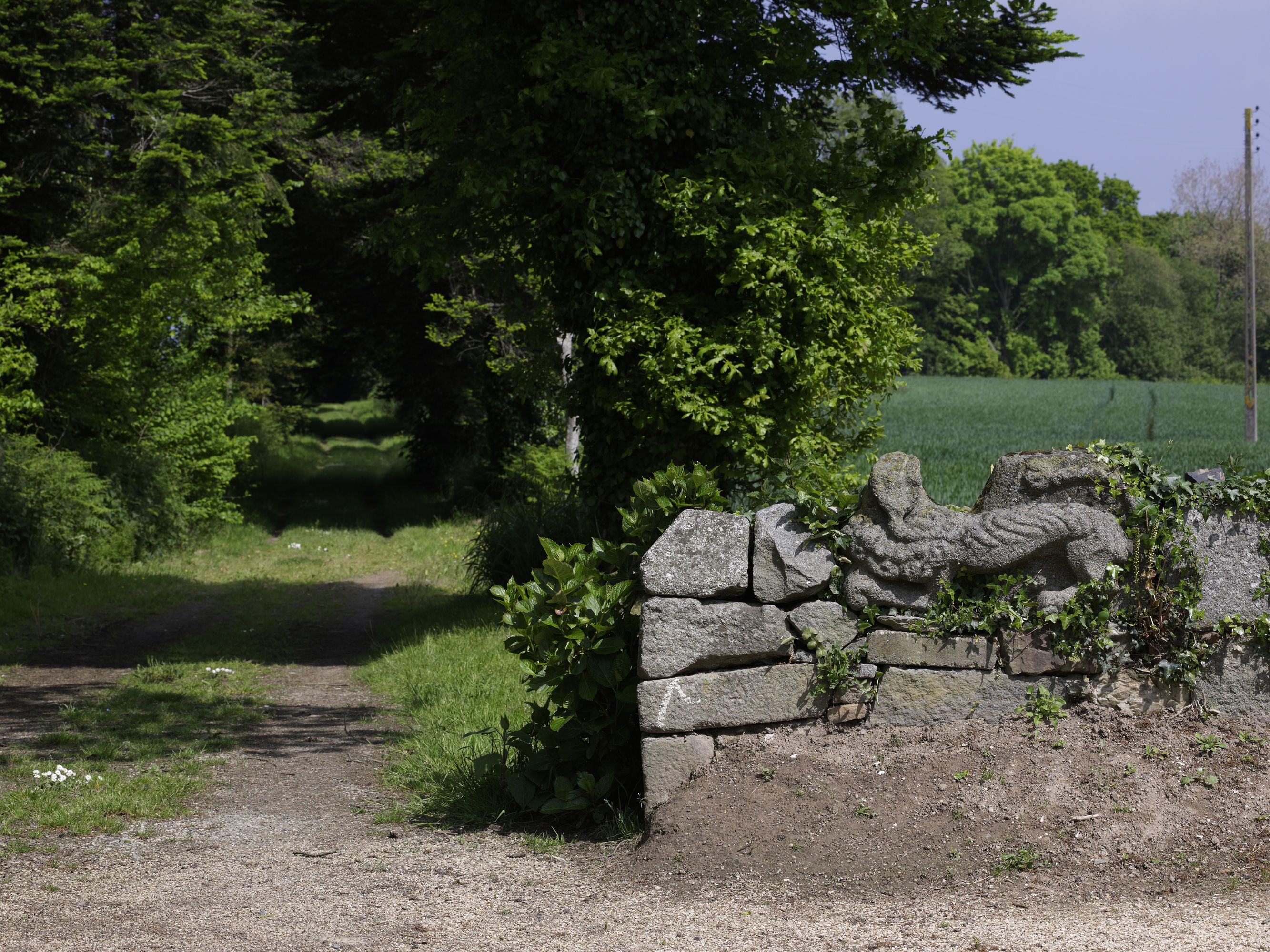 Caouënnec-Lanvézéac, bourg de Lanvézéac : église paroissiale de Saint-Ezéchiel, ancien décor de rampant dans un des muretsImmatriculation