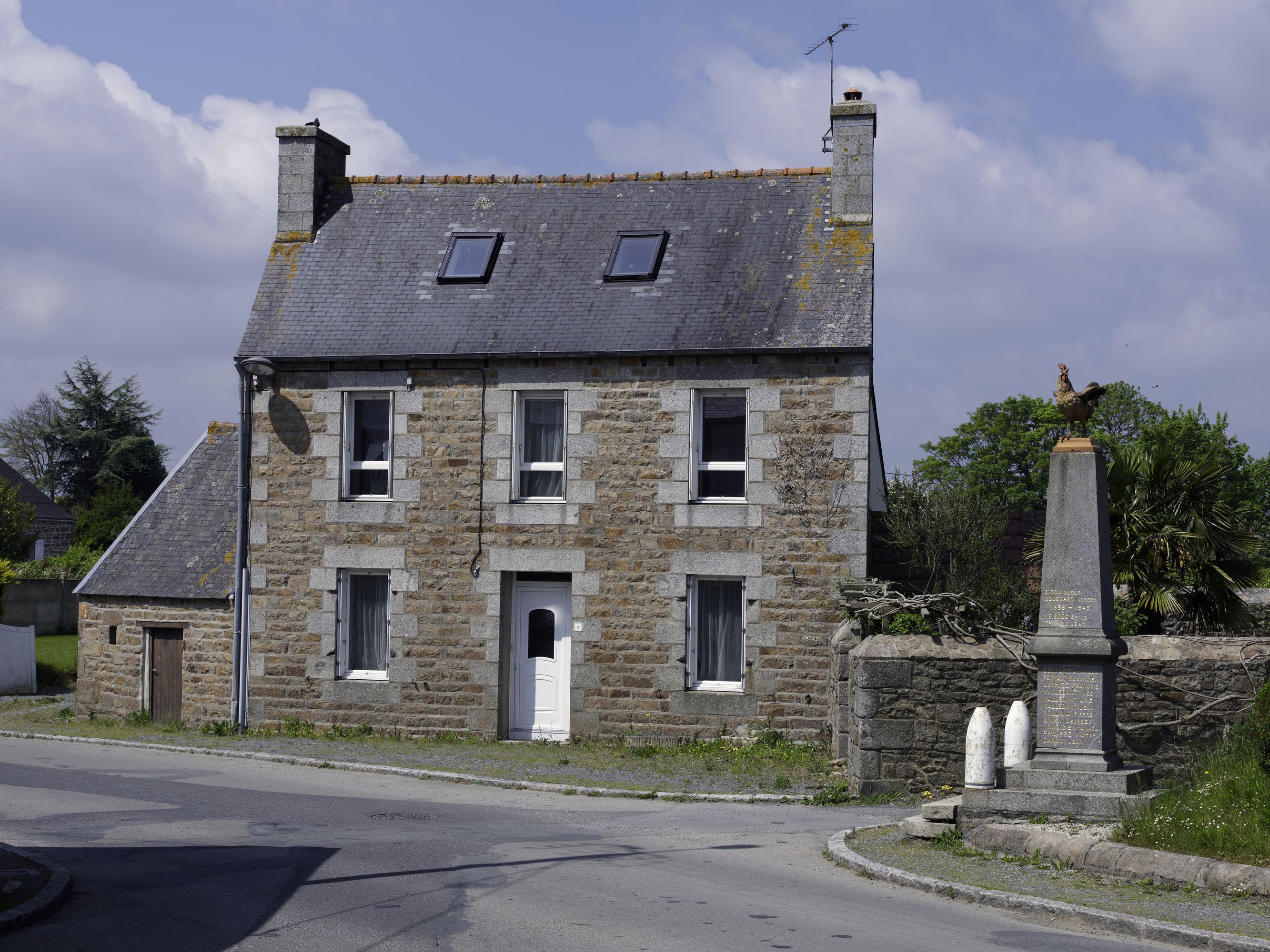 Caouënnec-Lanvézéac, bourg de Caouënnec, rue de la Mairie : maison et monument aux mortsImmatriculation