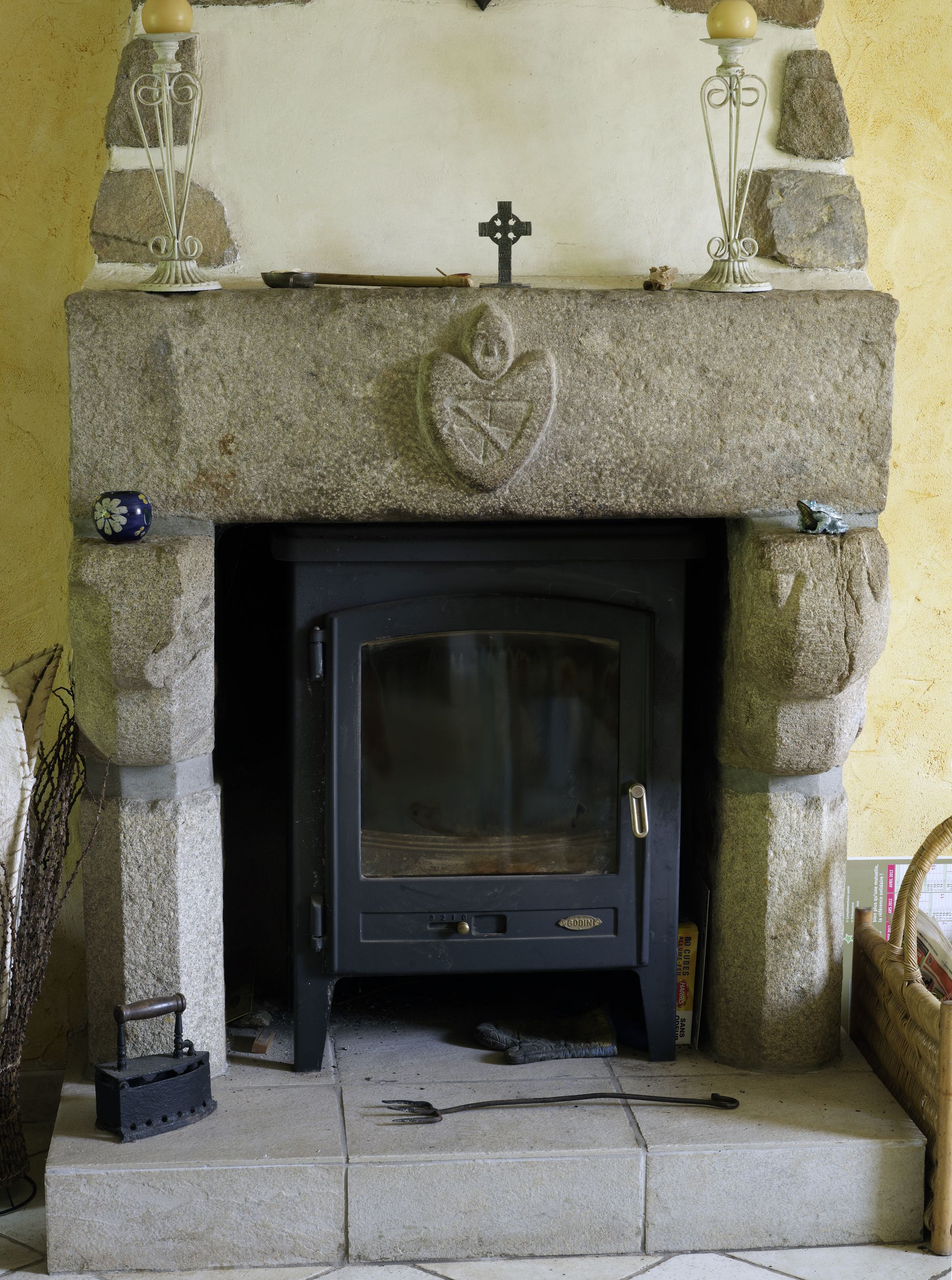 Caouënnec-Lanvézéac, Kerloscant : manoir, vue intérieure, rez-de-chaussée, cheminée est (remploi provenant d'une ferme)Immatriculation