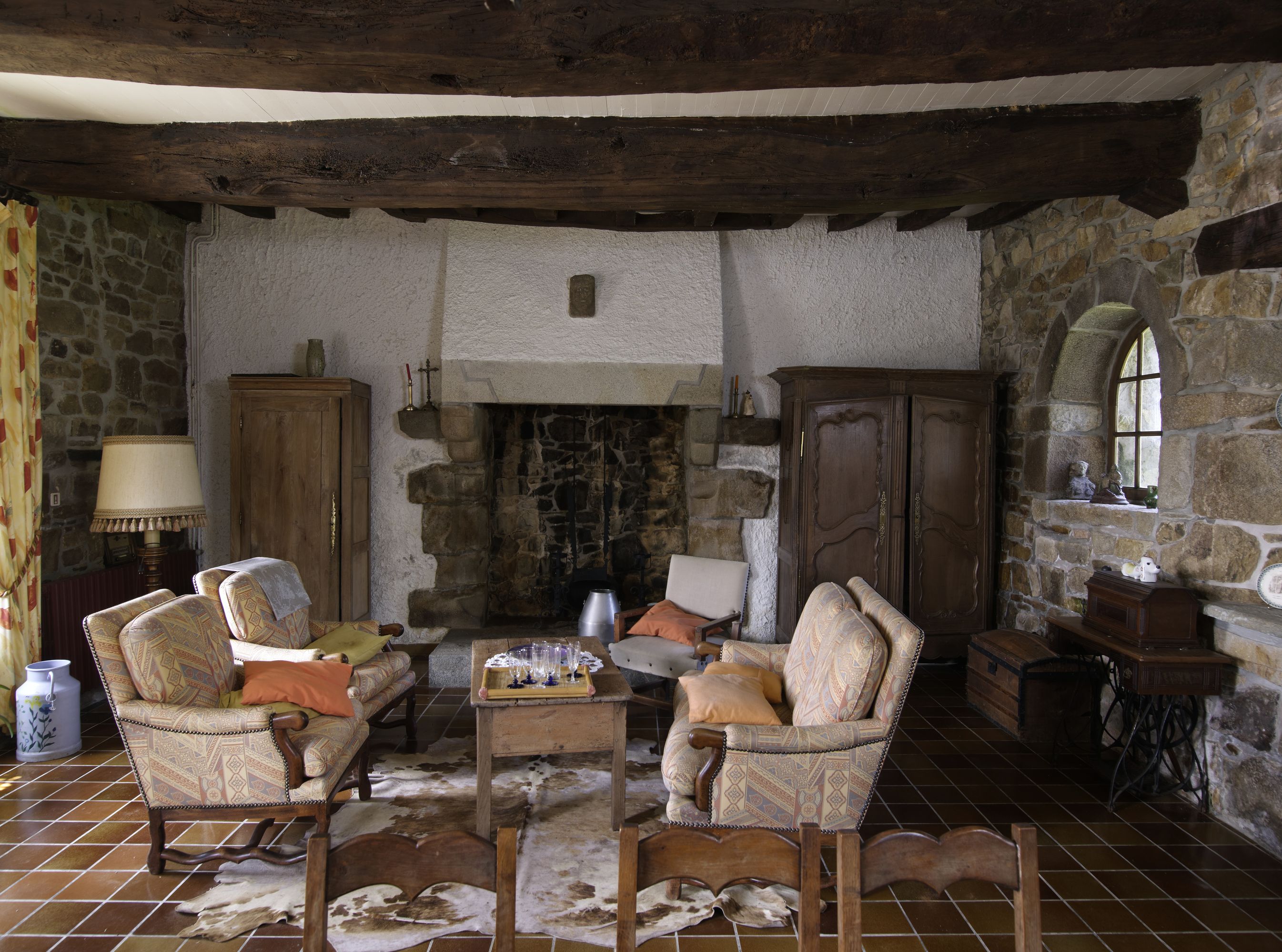 Caouënnec-Lanvézéac, Kerloscant : manoir, vue intérieure, rez-de-chaussée, salle basse avec cheminée surlemur ouestImmatriculation
