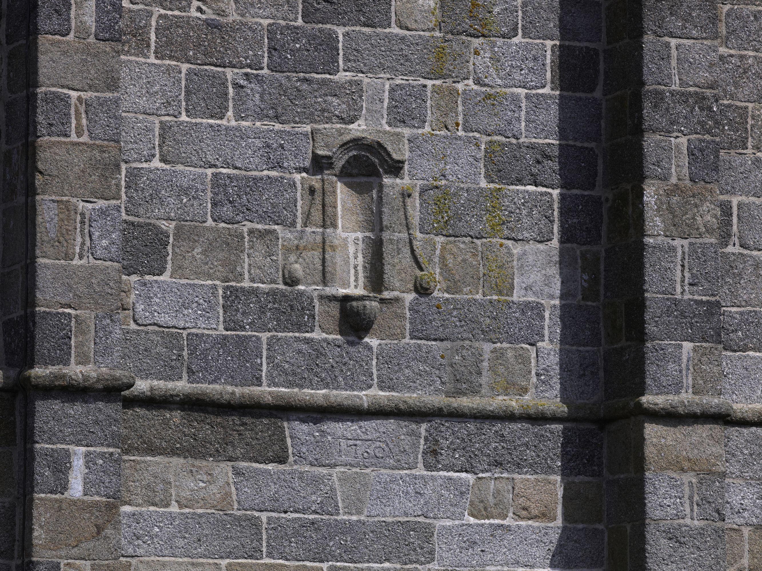 Caouënnec-Lanvézéac, bourg de Caouënnec : église paroissiale de Notre-Dame, vue de la date sur la tourImmatriculation