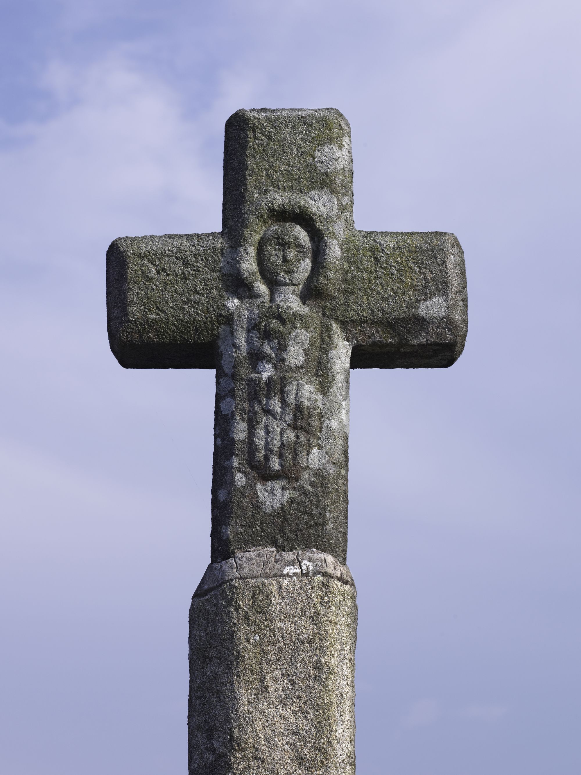 Caouënnec-Lanvézéac, Lanvézéac, carrefour : croix de chemin (17e ; 19e siècle), vue de détail de la croix, Vierge à l'enfantImmatriculation