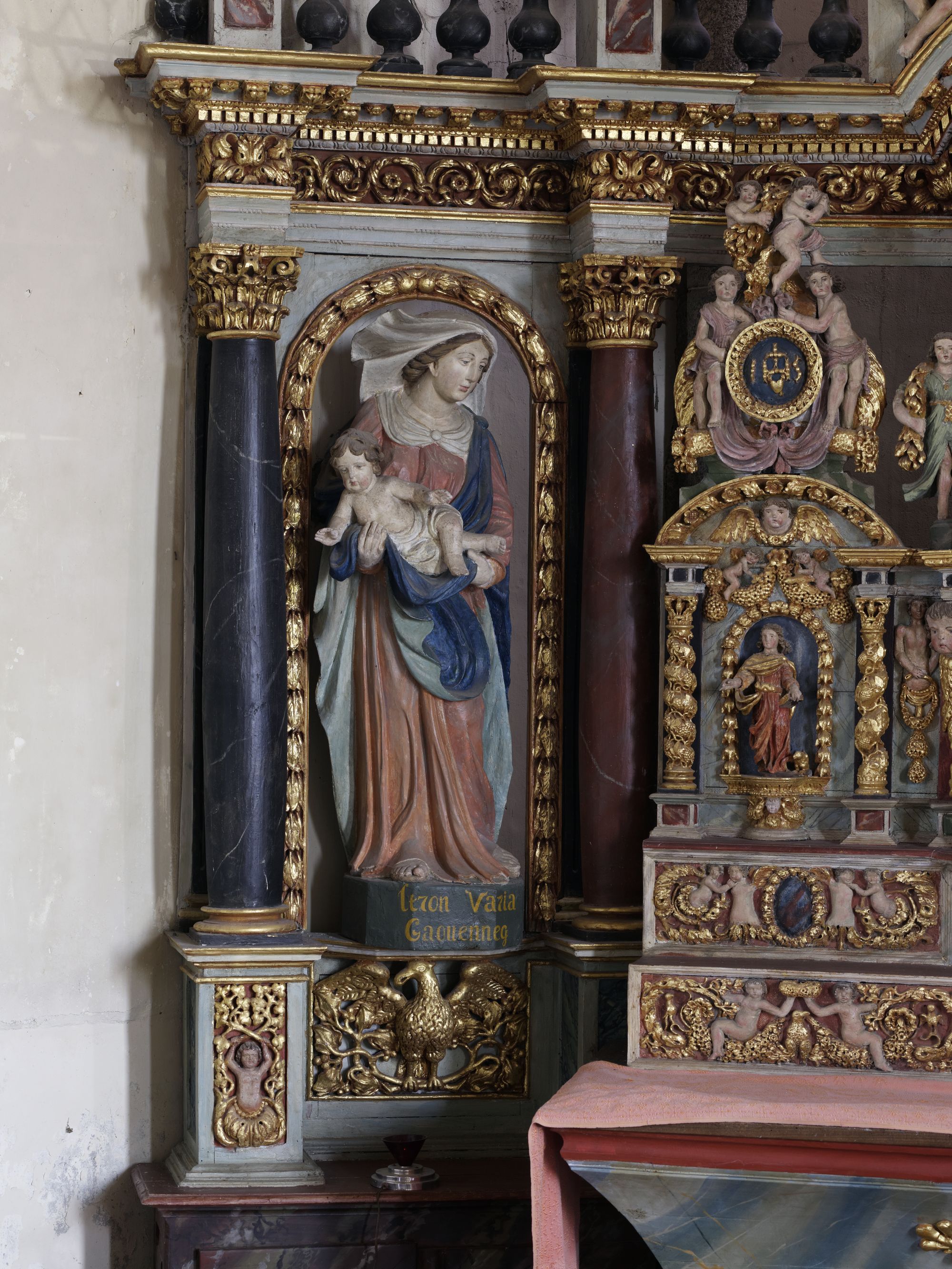 Caouënnec-Lanvézéac, bourg de Caouënnec : église paroissiale de Notre-Dame, statue du maitre-autelImmatriculation