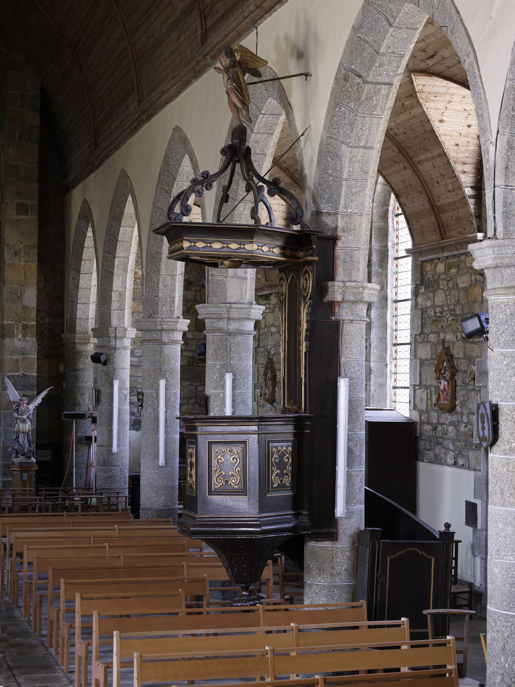 Caouënnec-Lanvézéac, bourg de Caouënnec : église paroissiale de Notre-Dame, chaire à prêcherImmatriculation