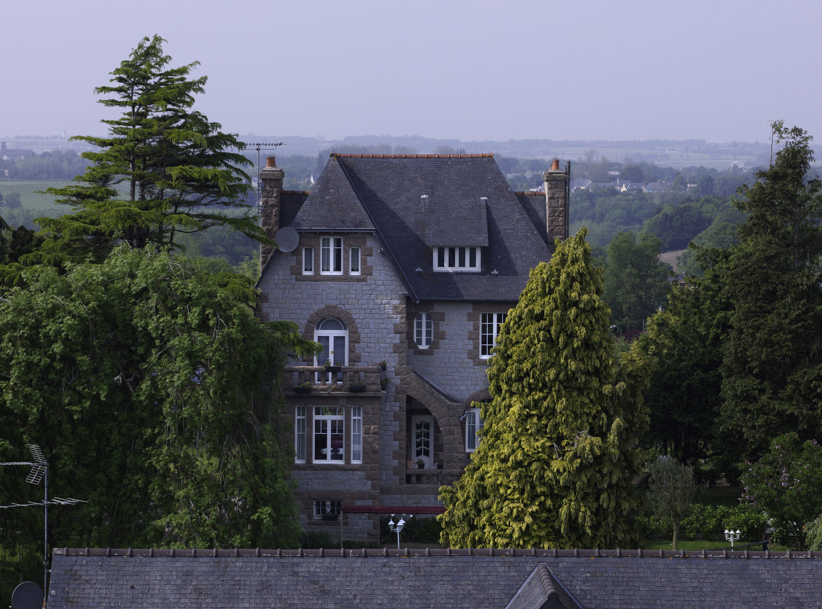 Caouënnec-Lanvézéac, Caouënnec, le bourg : maison située au nord de l'église, vue générale depuis le clocher de l'église paroissiale de Notre-DameImmatriculation