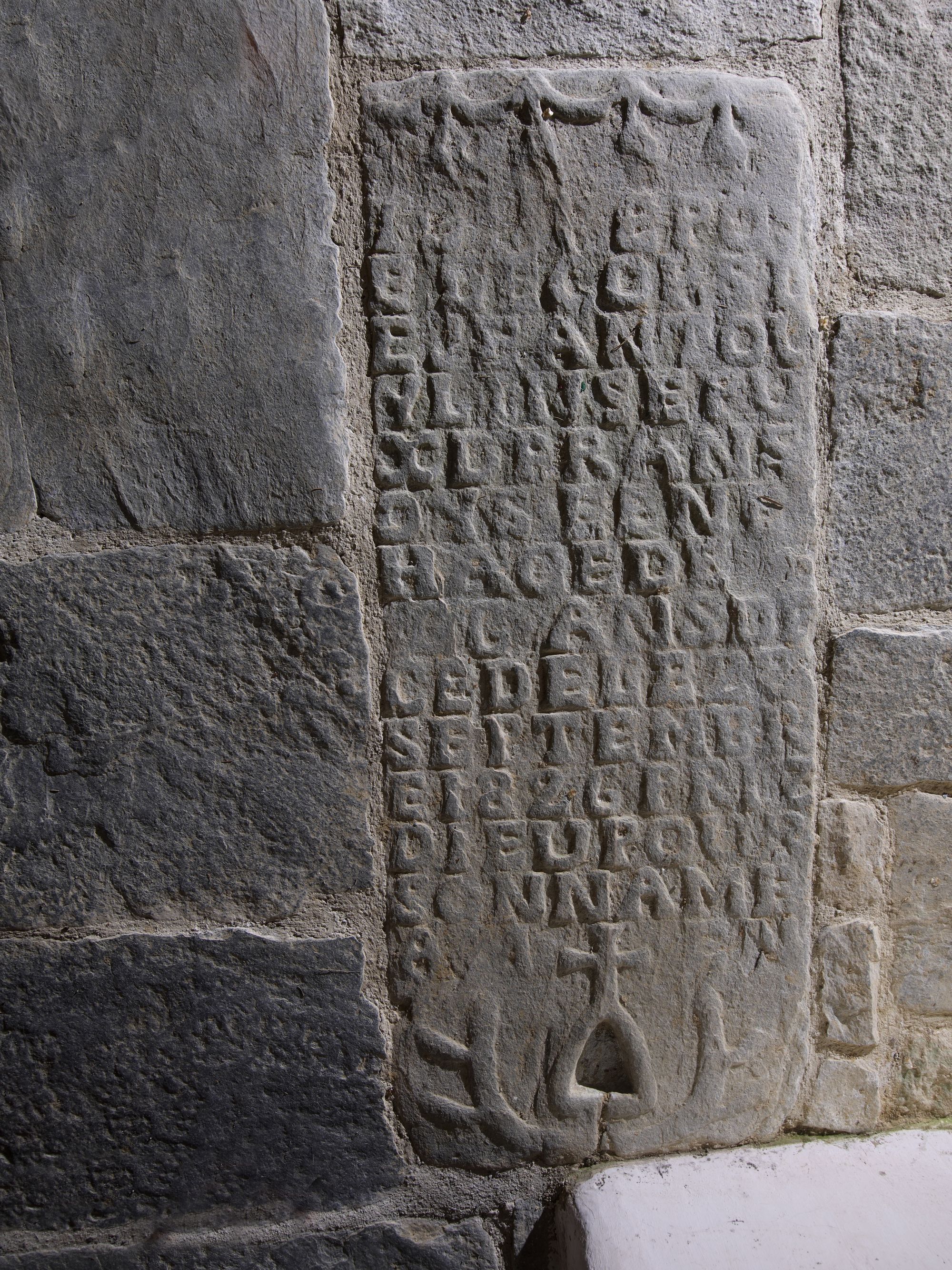 Caouënnec-Lanvézéac, bourg de Lanvézéac : église paroissiale de Saint-Ezéchiel, nef, pierre tombaleImmatriculation