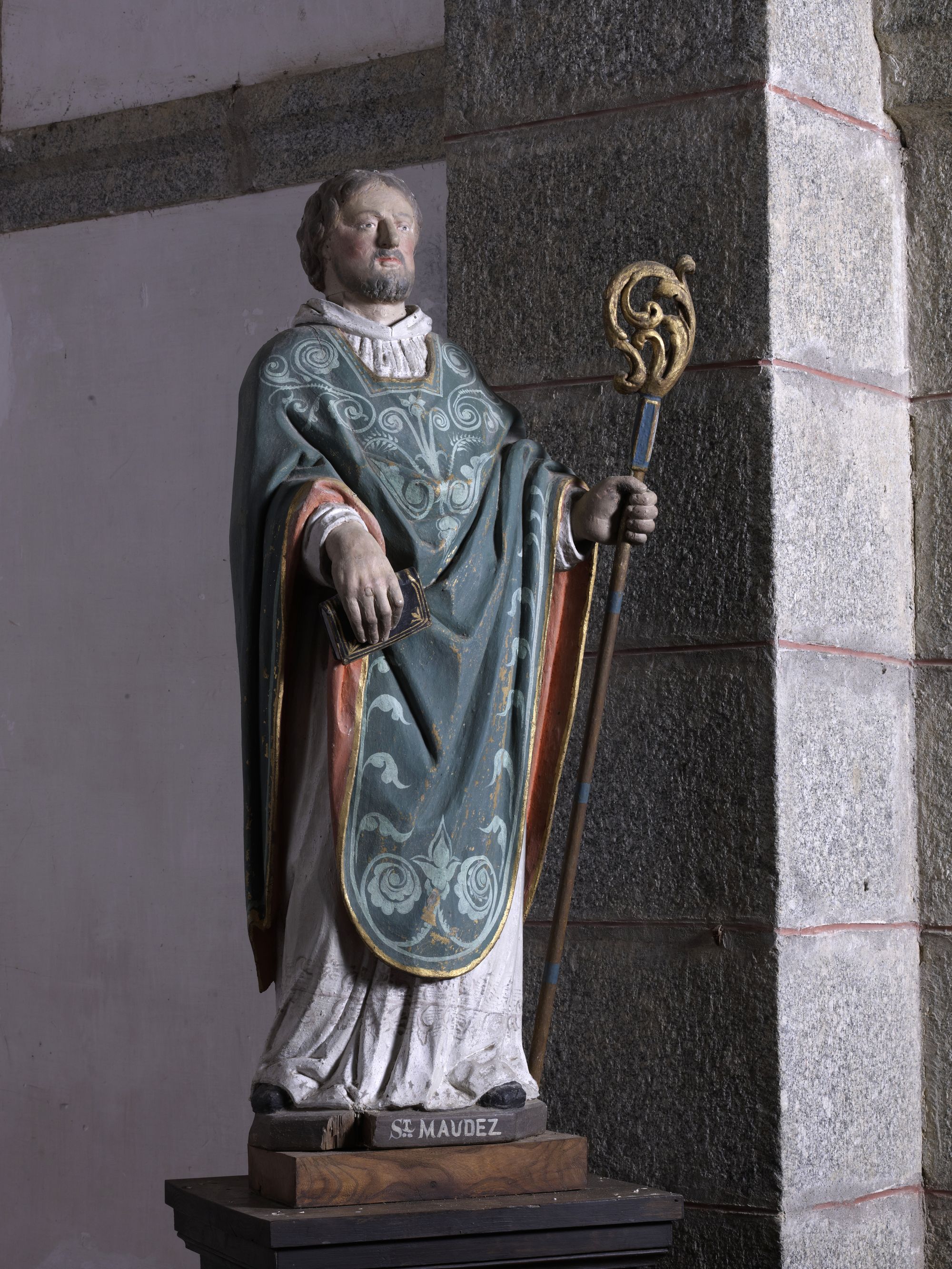 Coatascorn, le bourg : église paroissiale de Saint-Maudez, statue d'évêqueImmatriculation