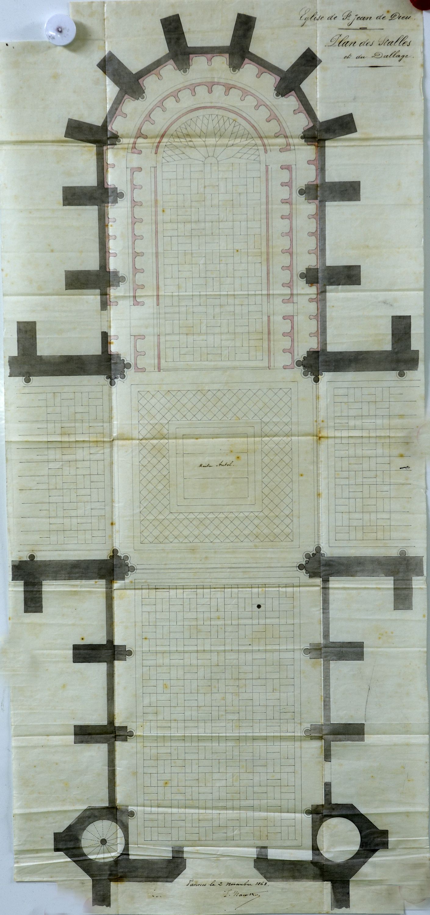 Plan des stalles et du dallage de la chapelle des Sacrés Coeurs, de l'architecte Eugène Hawke, datant de novembre 1863Immatriculation