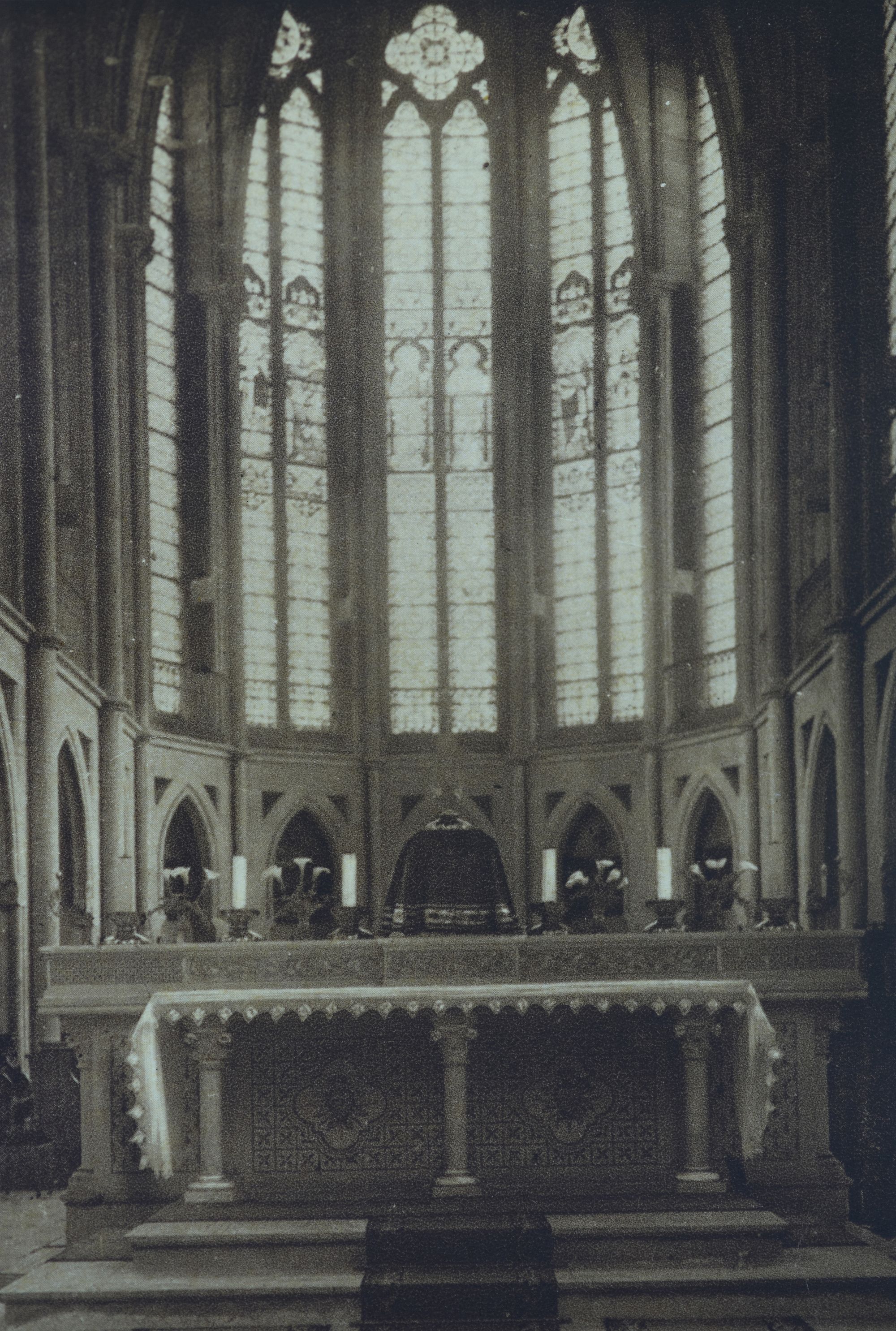 Photographie ancienne, intérieur de la chapelle des Sacrés Coeurs, choeur avec autel bi-faceImmatriculation