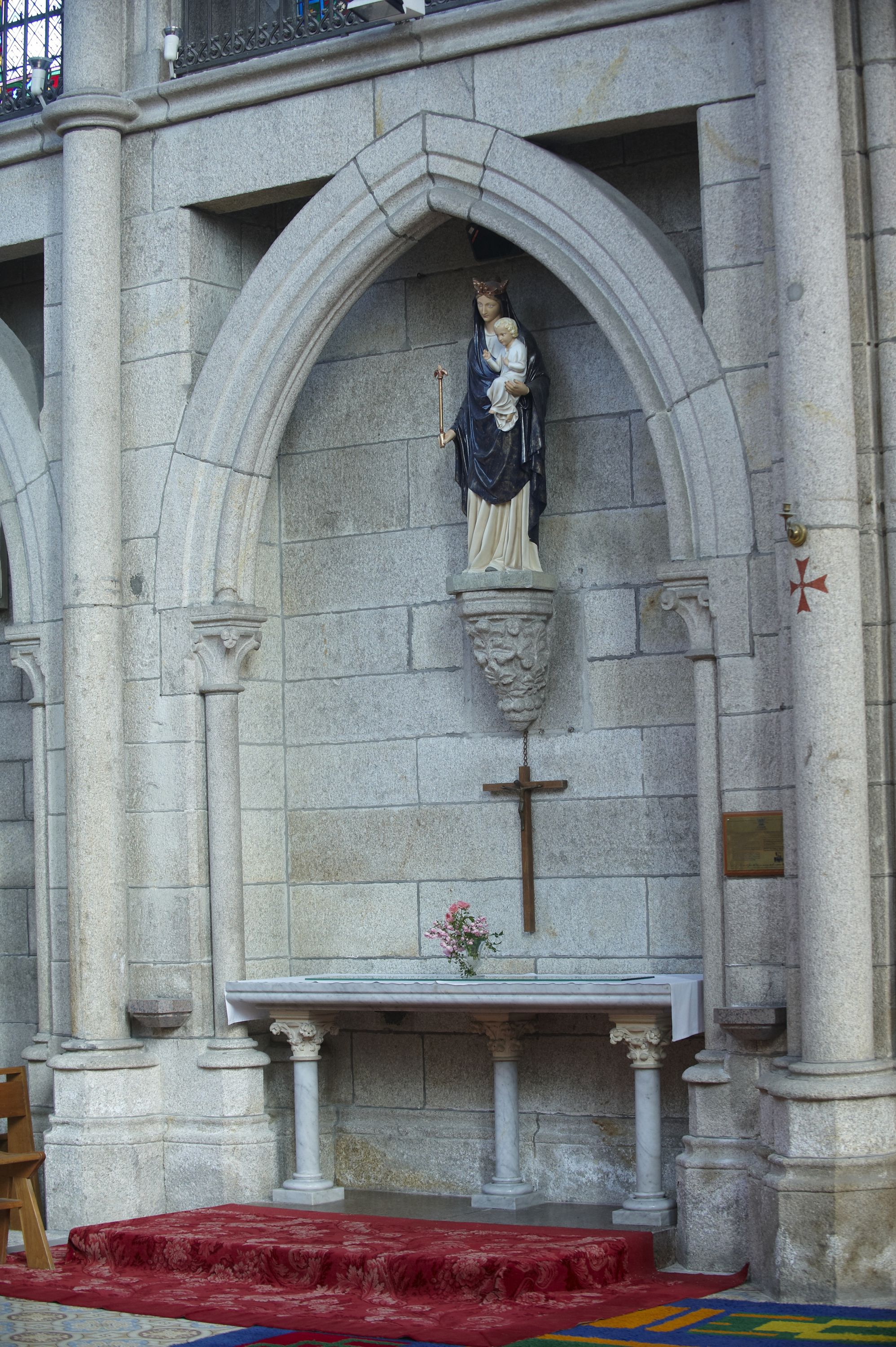 Intérieur de la chapelle des Sacrés Coeurs, détail d'une arcature de la nef, côté nord, avec sculpture de la Vierge MarieImmatriculation