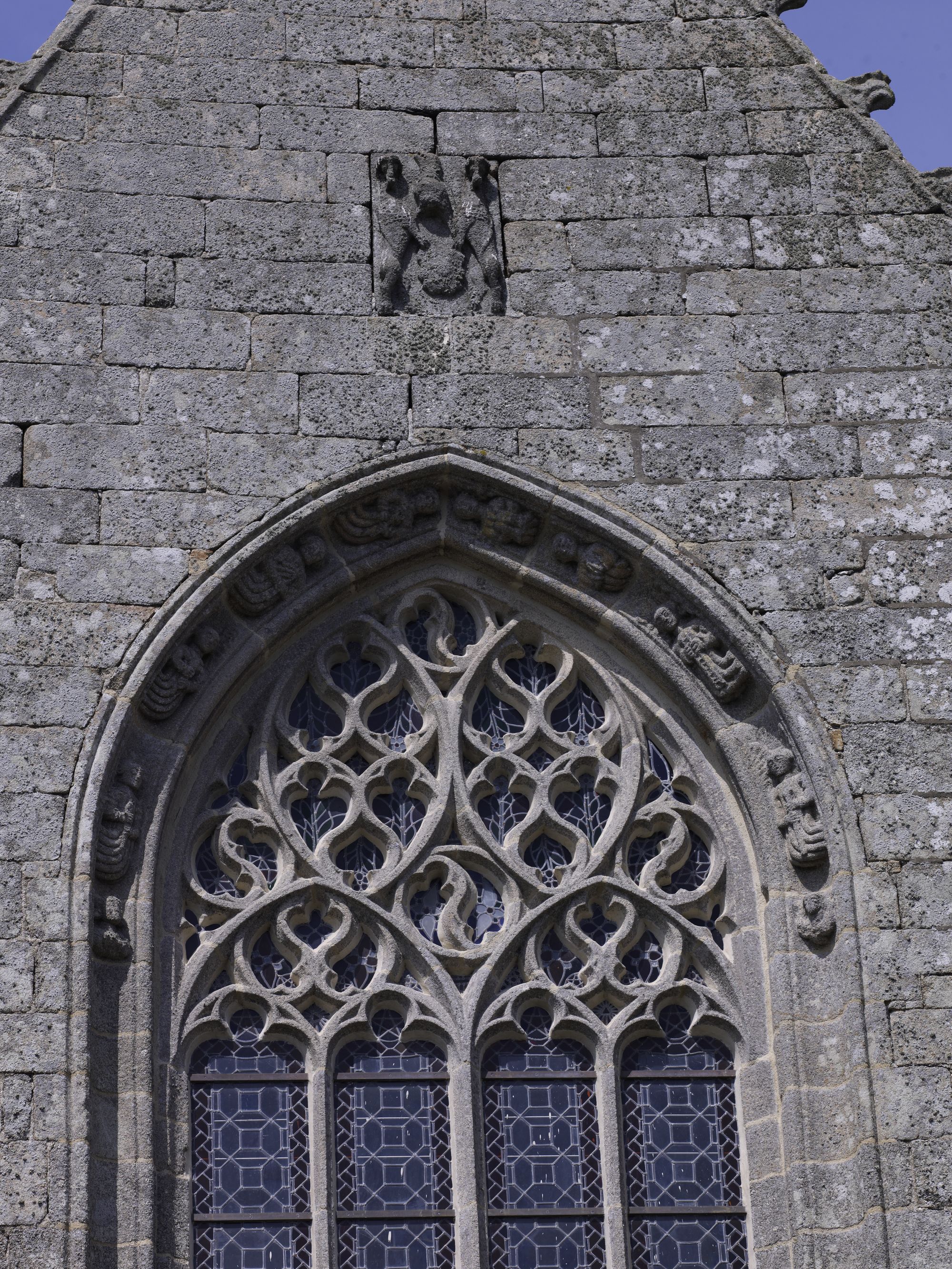 Berhet, Confort : chapelle Notre-Dame de Confort, vue de détail du chevet. Le fenestrage est surmonté d'armoiriesImmatriculation