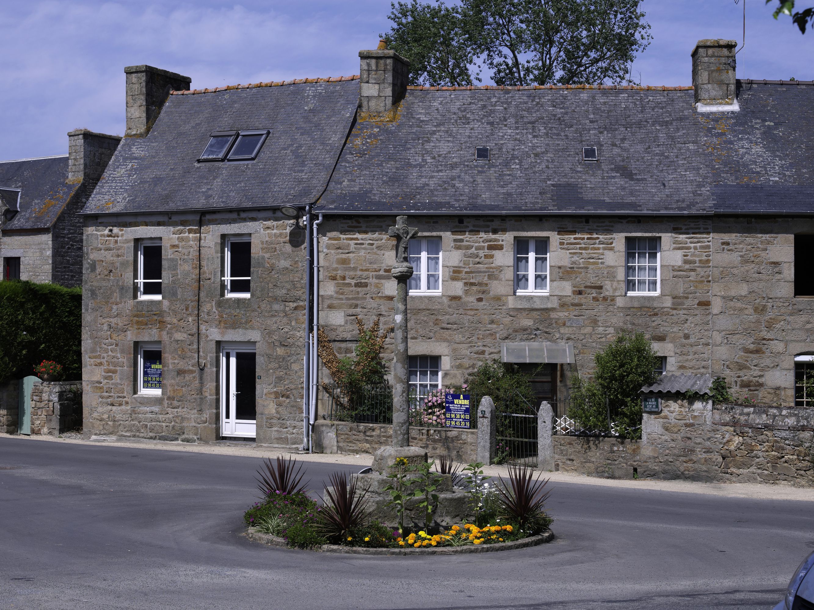 Tonquédec, le bourg, rue de la Mairie : croix de chemin, vue générale. En arrière plan : alignement de maisonsImmatriculation