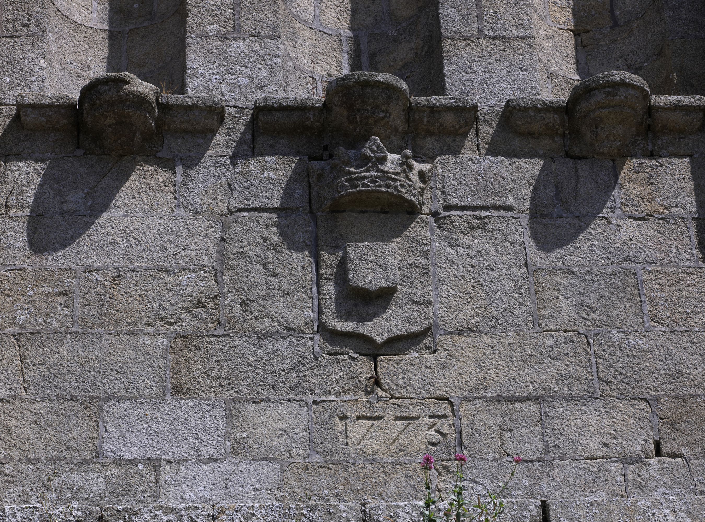 Tonquédec, le bourg : église paroissiale Saint-Pierre, armoiries et millésime 1773, vue de détailImmatriculation