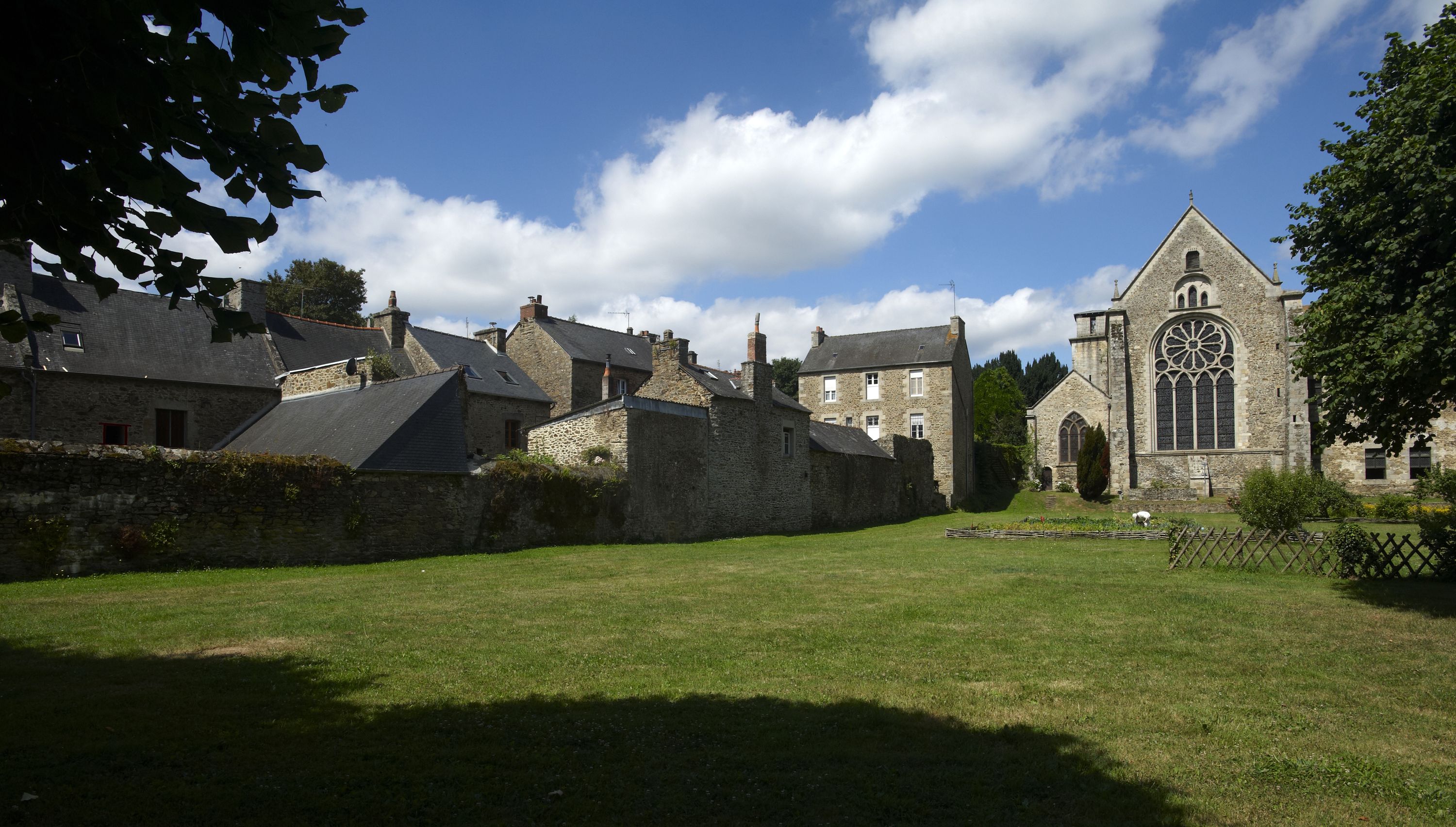 Vue générale de l'abbaye depuis le jardin, à gauche du chevet de l'abbatiale et de la chapelle des Beaumanor, le presbytère construit en 1880Immatriculation