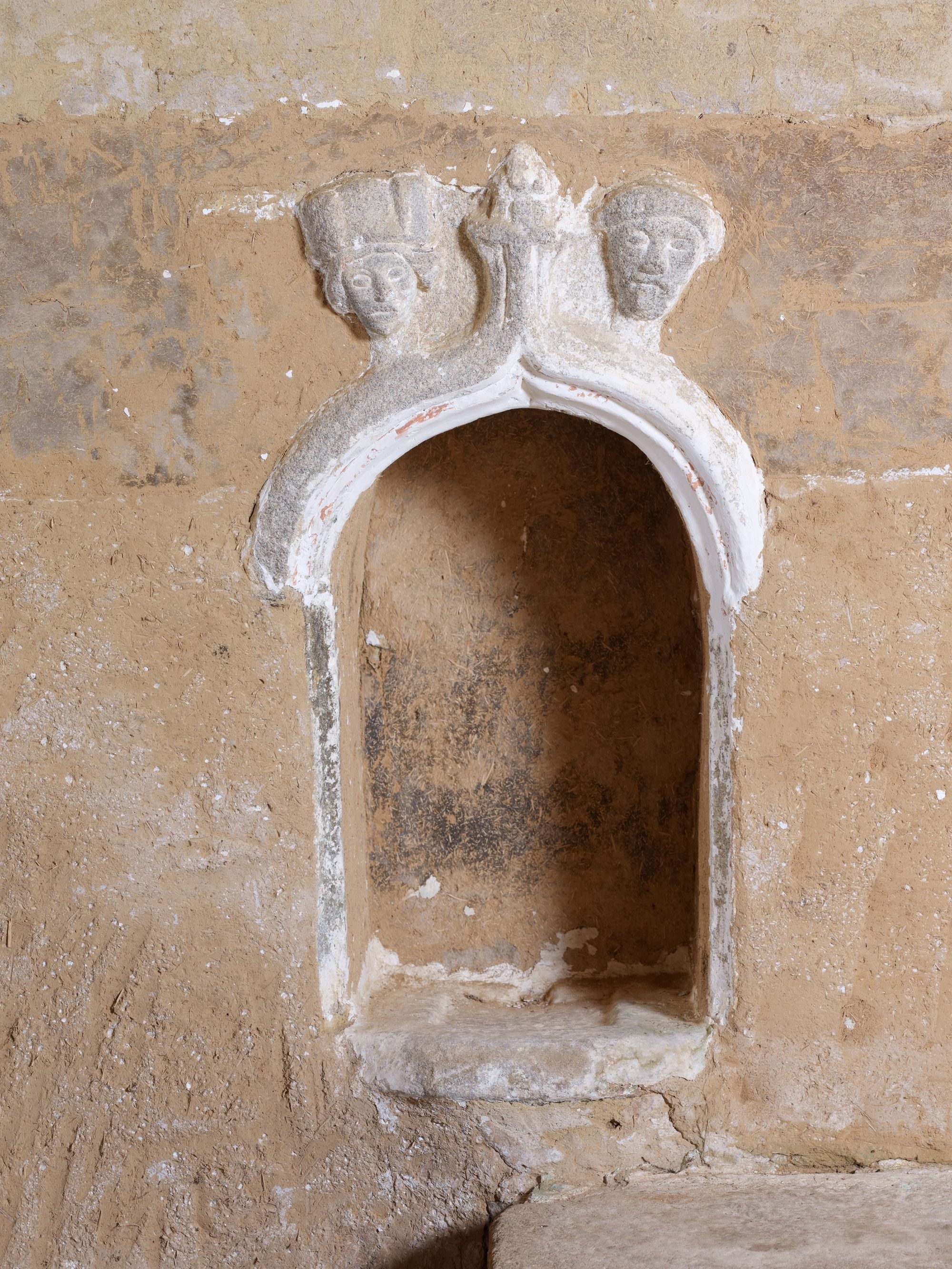 Tonquédec, Kerrivoalan : chapelle Notre-Dame, vue intérieure, mur sud, emplacement de la niche-crédence. De l'italien credenza : confiance, il s'agit d'une petite niche où l'on dépose les burettes, le manuterge, le bassin... Il s'agit peut-être des visages des fondateurs de la chapelleImmatriculation