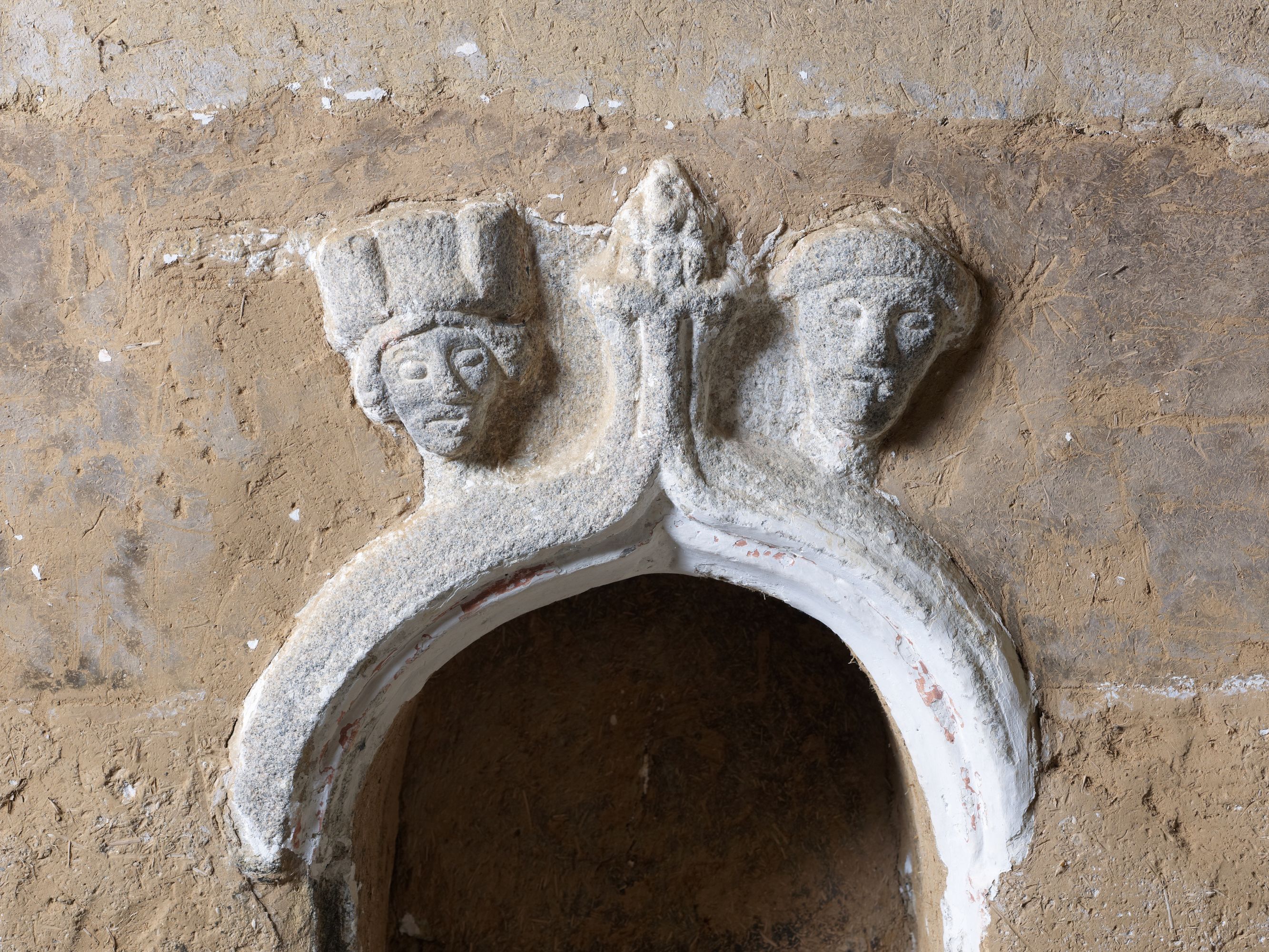 Tonquédec, Kerrivoalan : chapelle Notre-Dame, vue intérieure, mur sud, emplacement de la niche-crédence. De l'italien credenza : confiance, il s'agit d'une petite niche où l'on dépose les burettes, le manuterge, le bassin... Il s'agit peut-être des visages des fondateurs de la chapelleImmatriculation