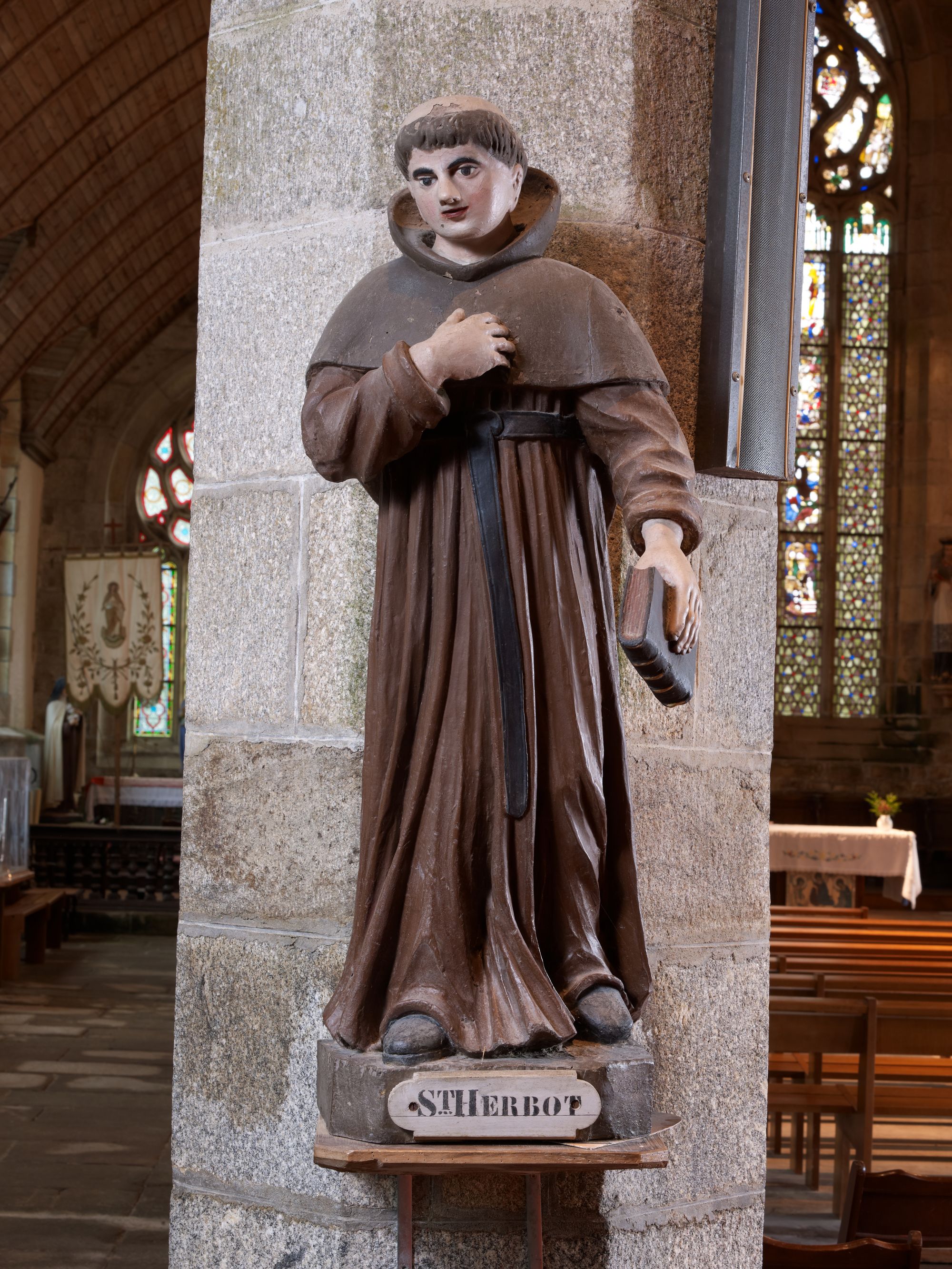 Tonquédec, le bourg : église paroissiale Saint-Pierre, vue intérieure, statue de Saint HerbotImmatriculation