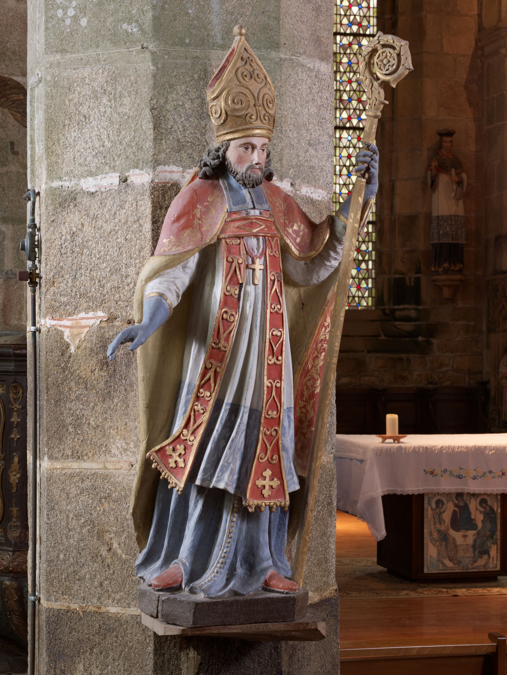 Tonquédec, le bourg : église paroissiale Saint-Pierre, vue intérieure, statue de SaintImmatriculation