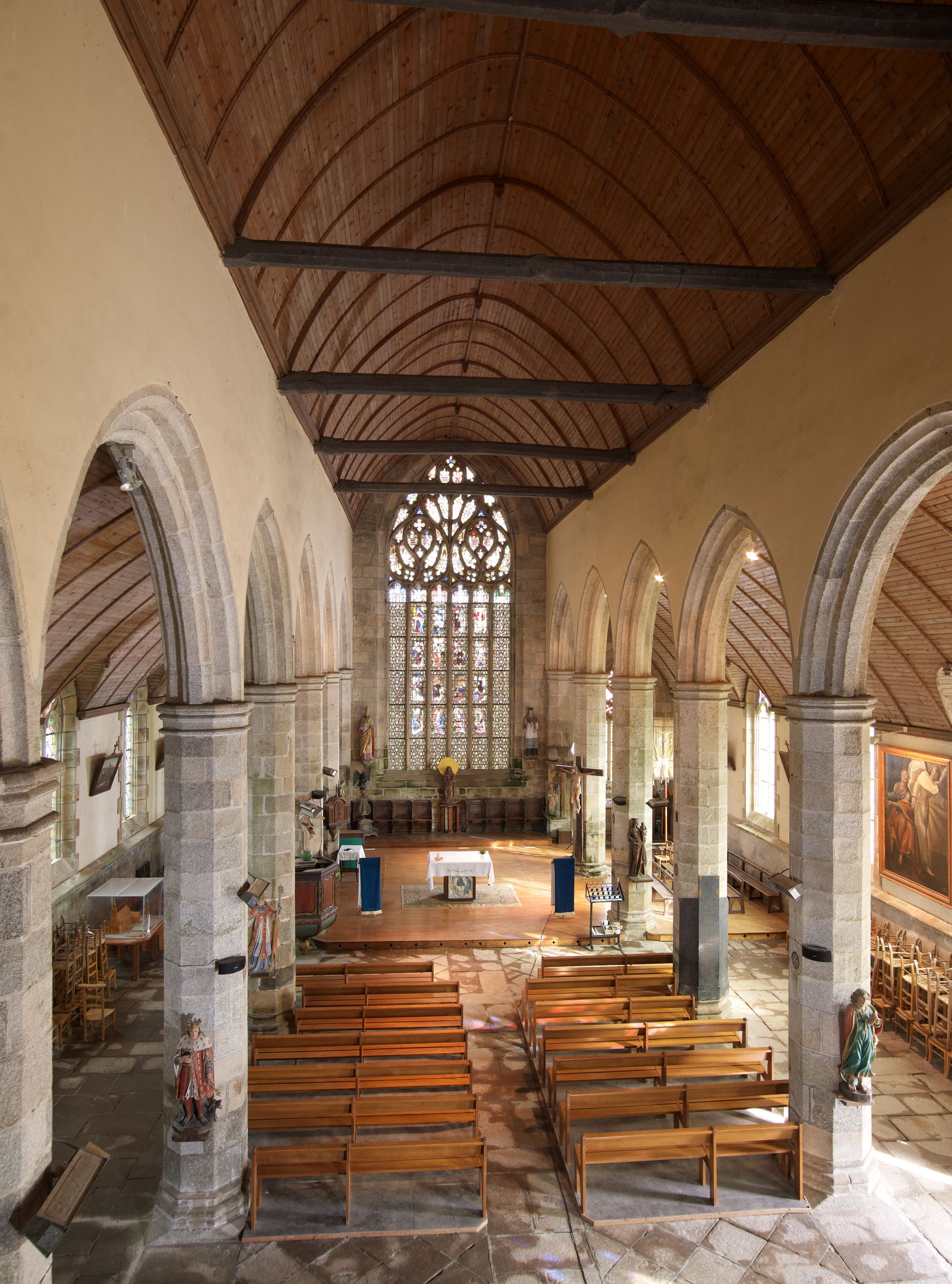 Tonquédec, le bourg : église paroissiale Saint-Pierre, vue intérieure verticale vers le chœurImmatriculation