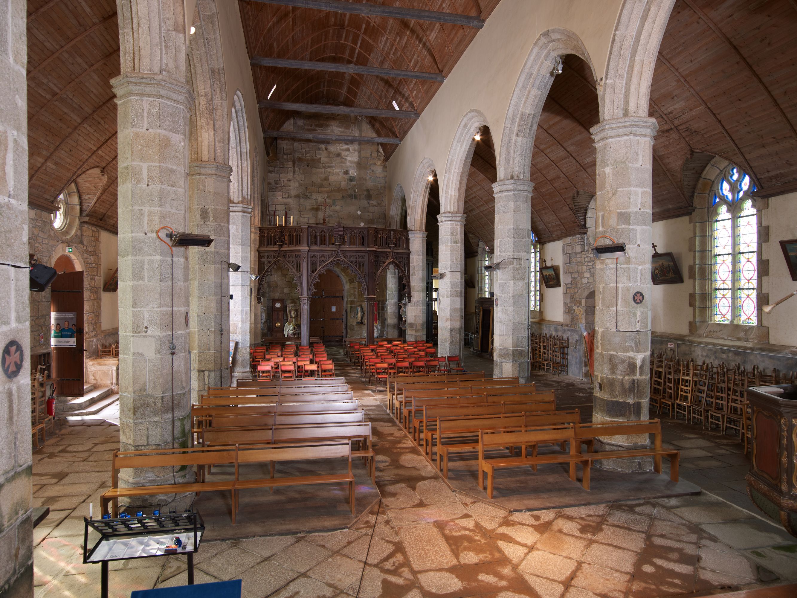 Tonquédec, le bourg : église paroissiale Saint-Pierre, vue intérieure vers la nefImmatriculation