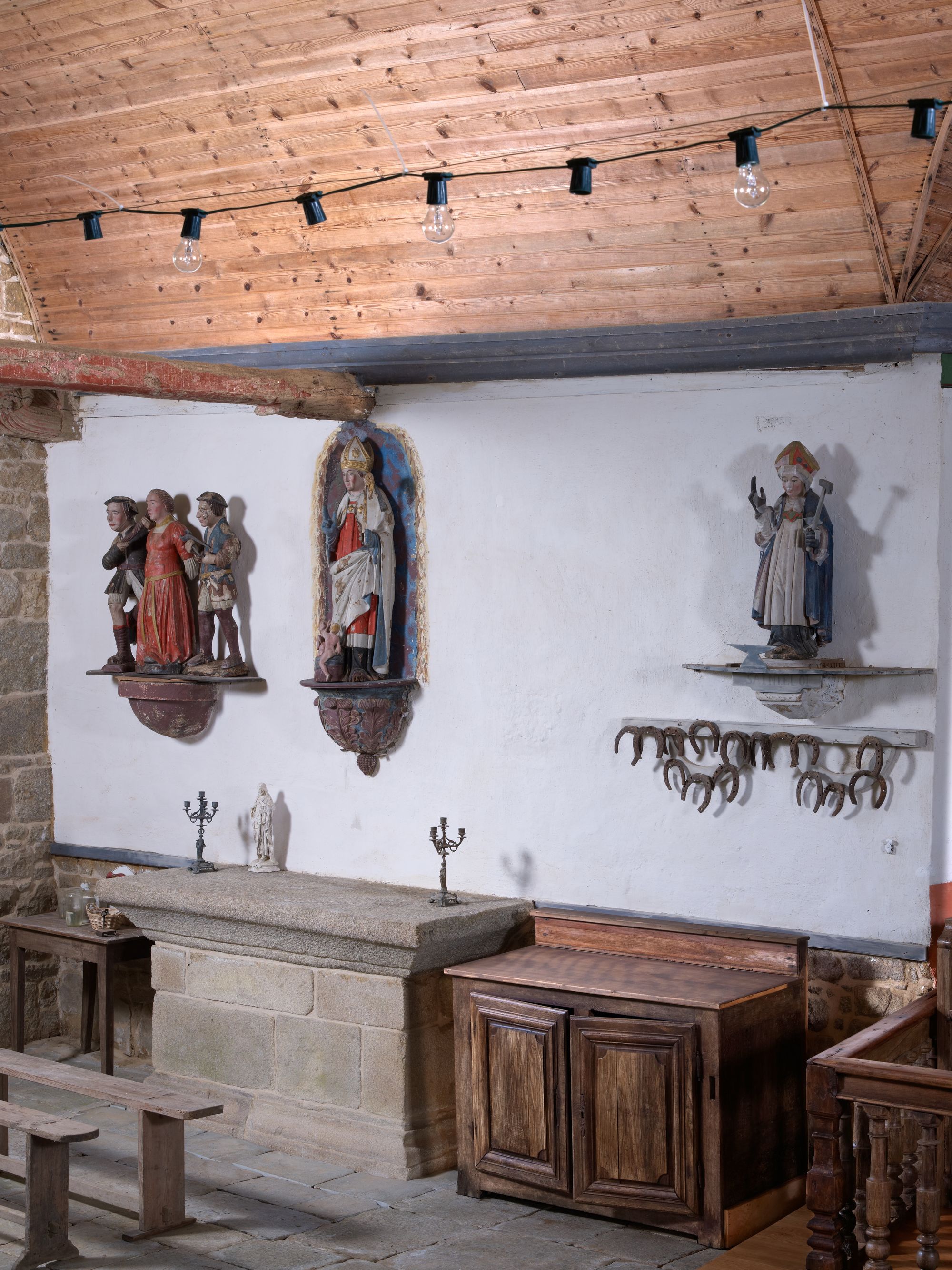 Tonquédec, Saint-Gildas : chapelle, vue intérieure, transept nord, Sainte Apolline entre ses bourreaux, Saint Nicolas et Saint Eloi (fers à cheval, enclume et marteau)Immatriculation
