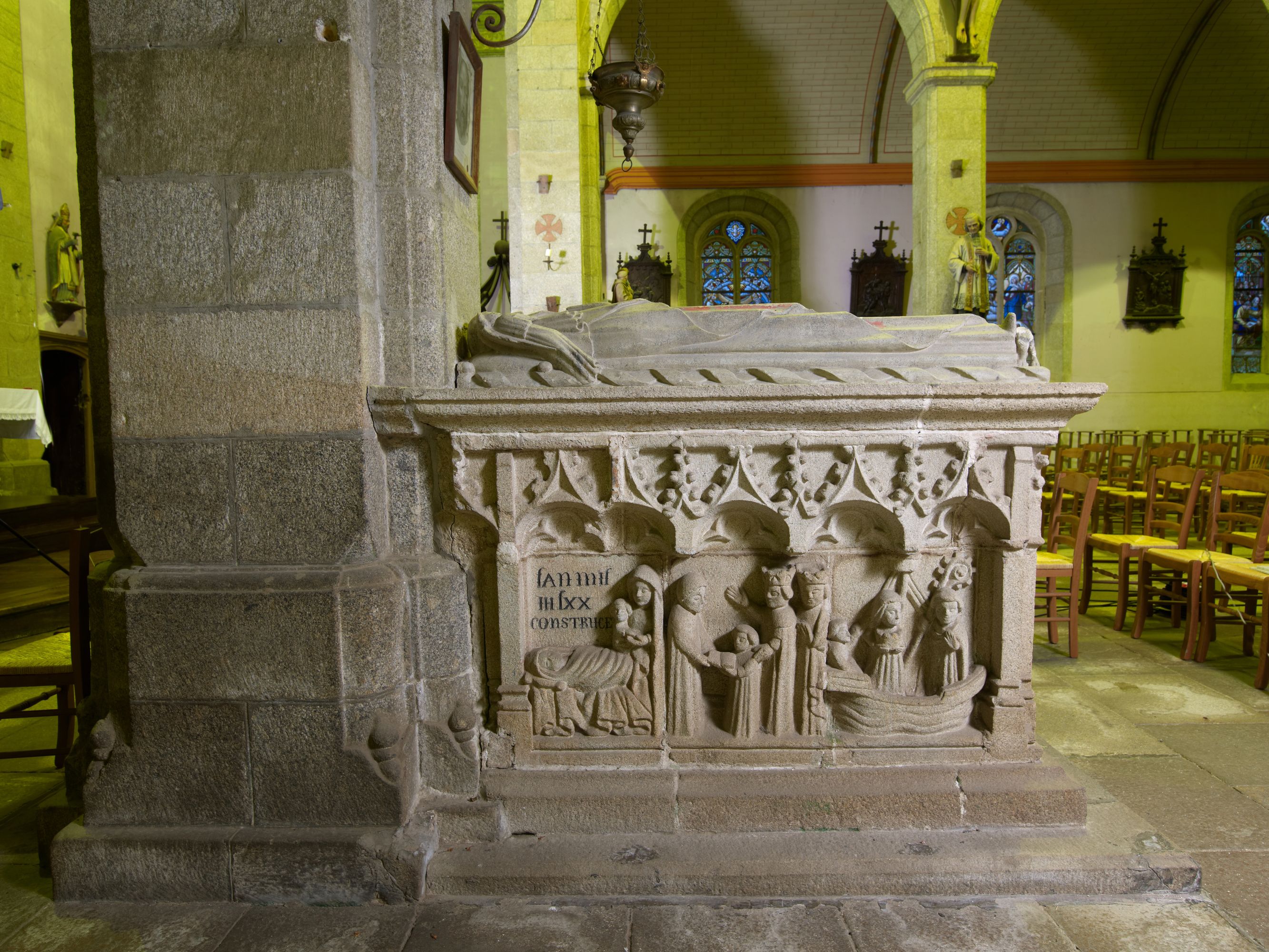 Langoat, le bourg : église paroissiale Sainte-Pompée, tombeau à gisant de Sainte-Pompée, face nord. Elle porte l'inscription : "lAN MIL III lXX [1370] CONSTRUCE"Immatriculation