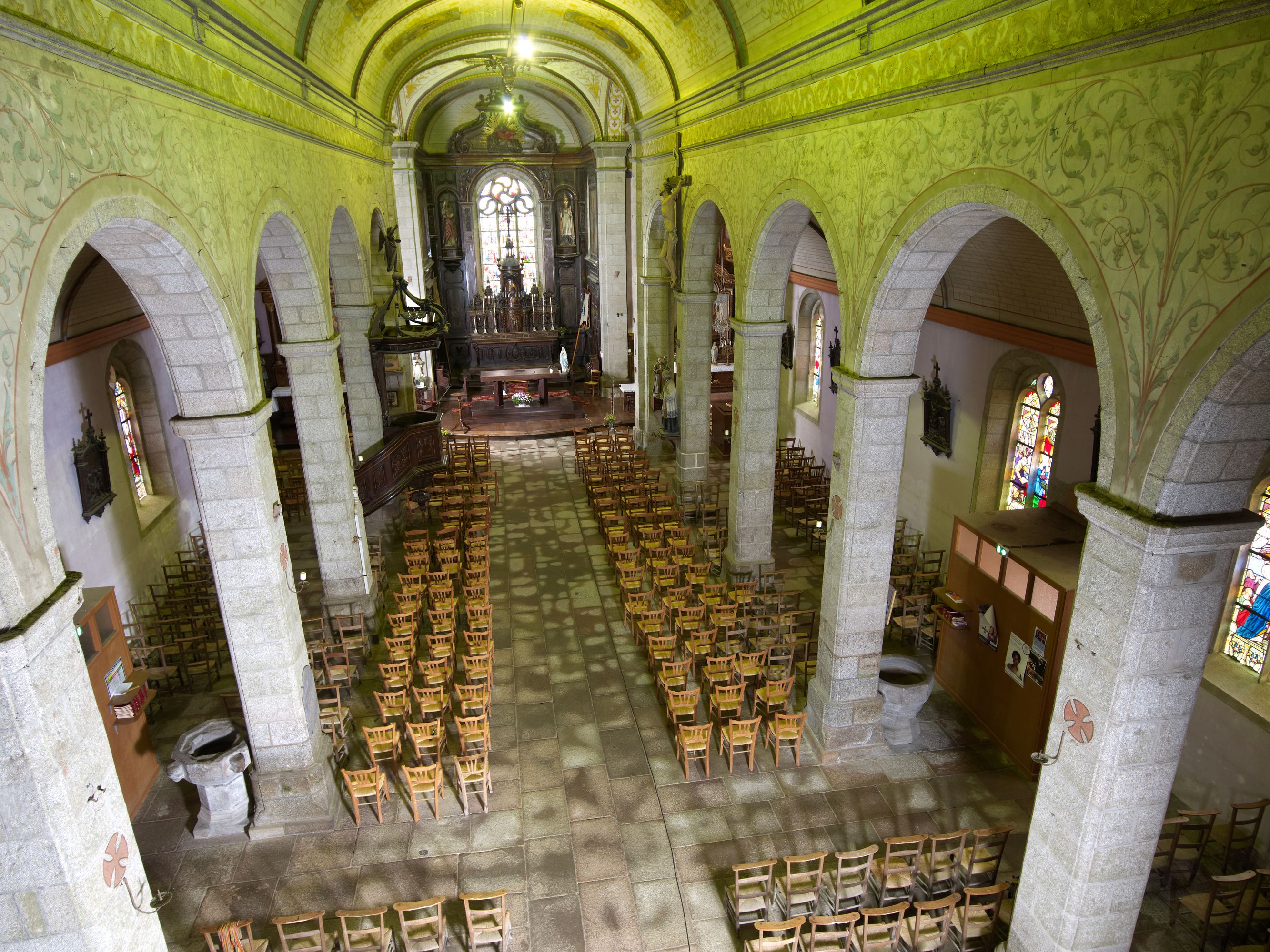 Langoat, le bourg : église paroissiale Sainte-Pompée, vue de la nef vers le chœur depuis la tribune de l'orgueImmatriculation