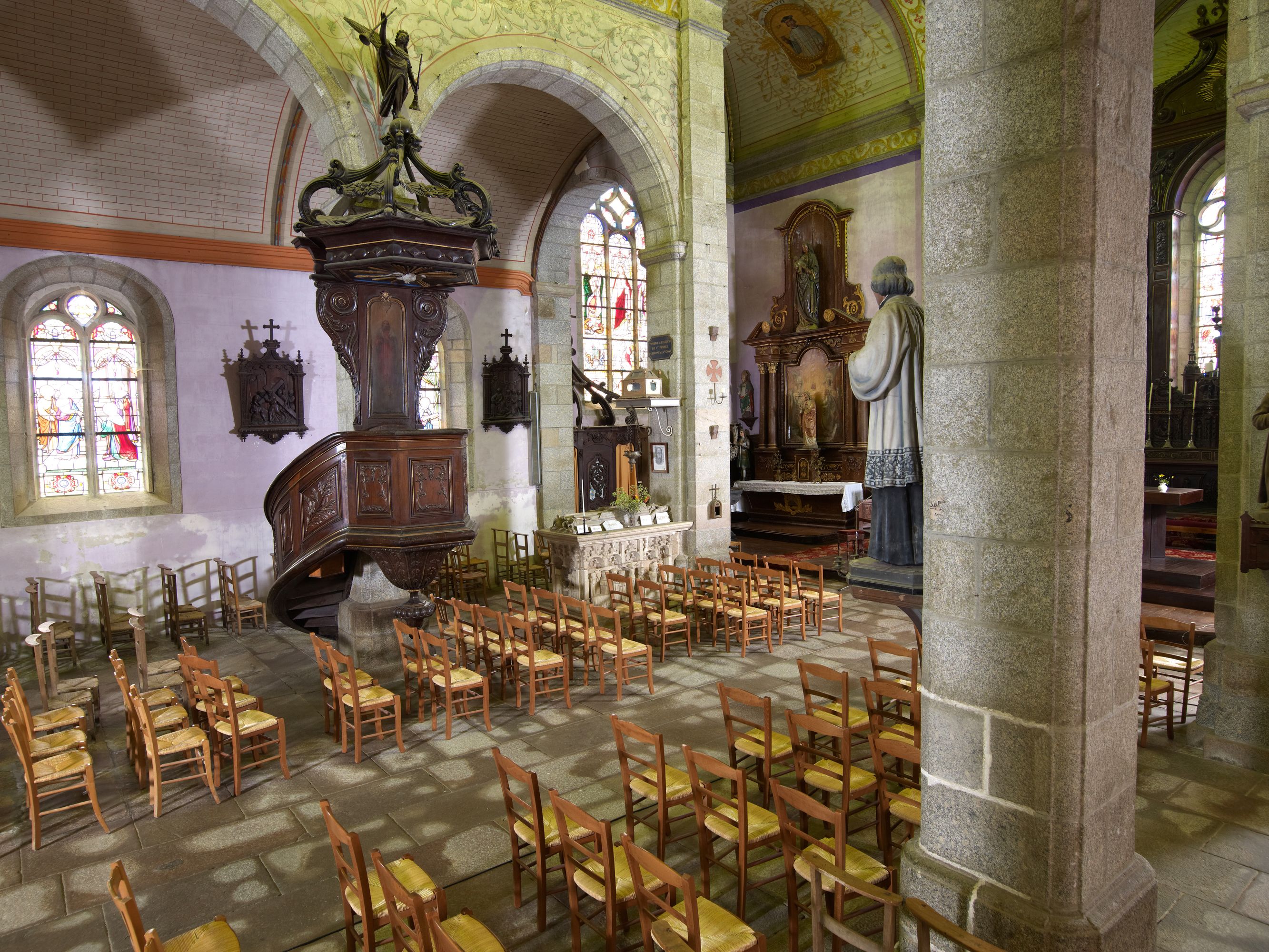 Langoat, le bourg : église paroissiale Sainte-Pompée, vue de la nef vers la chaire à prêcher et le transept nordImmatriculation