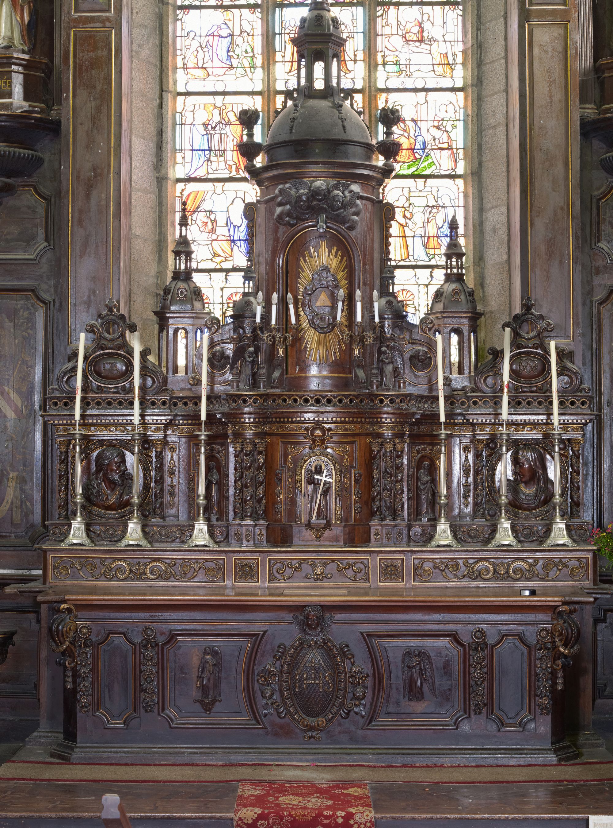 Langoat, le bourg : église paroissiale Sainte-Pompée, vue de détail du maître-autelImmatriculation
