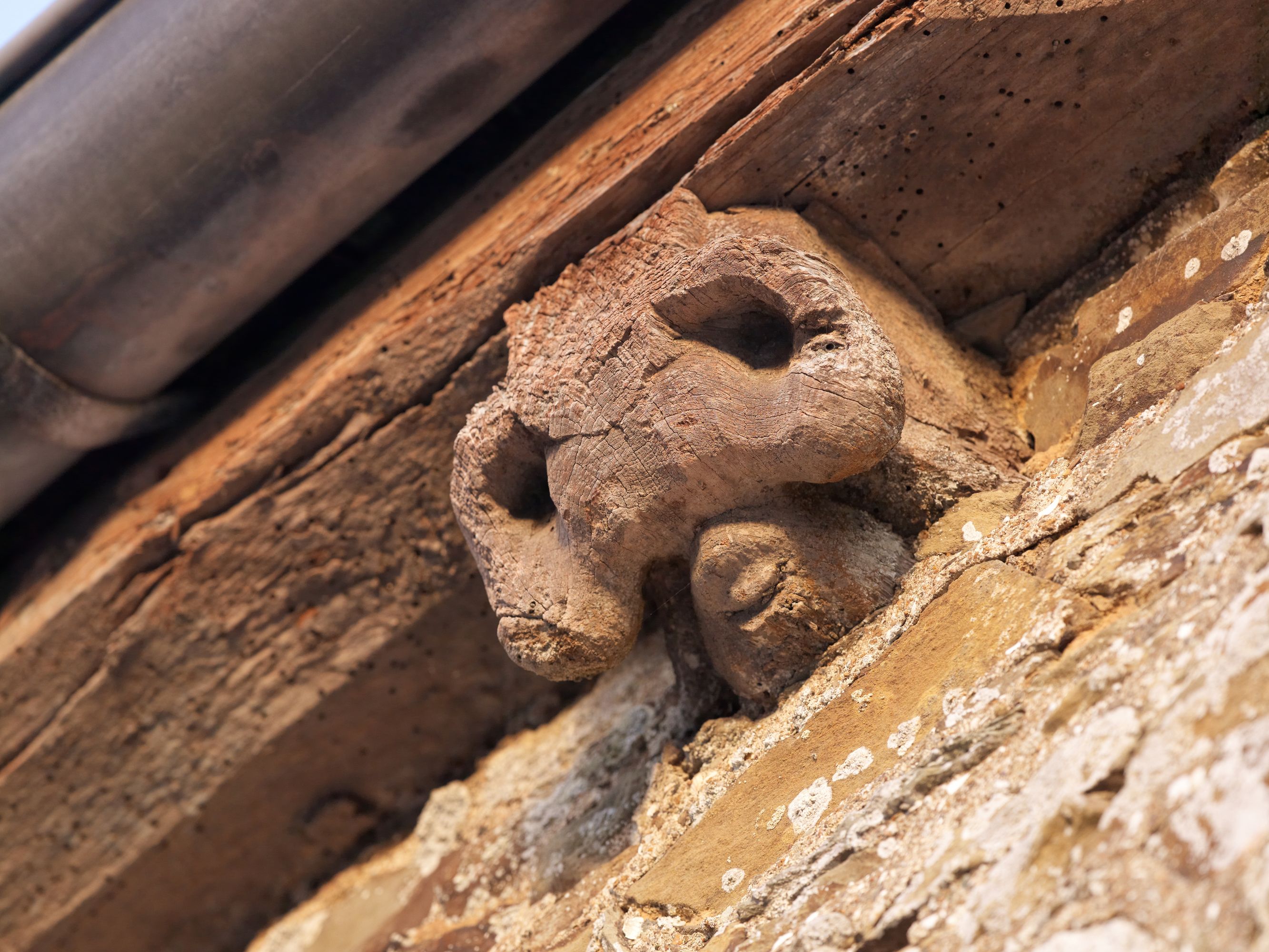 Transept sud, mur ouest. Détail d'un embout de poutre sculptéImmatriculation