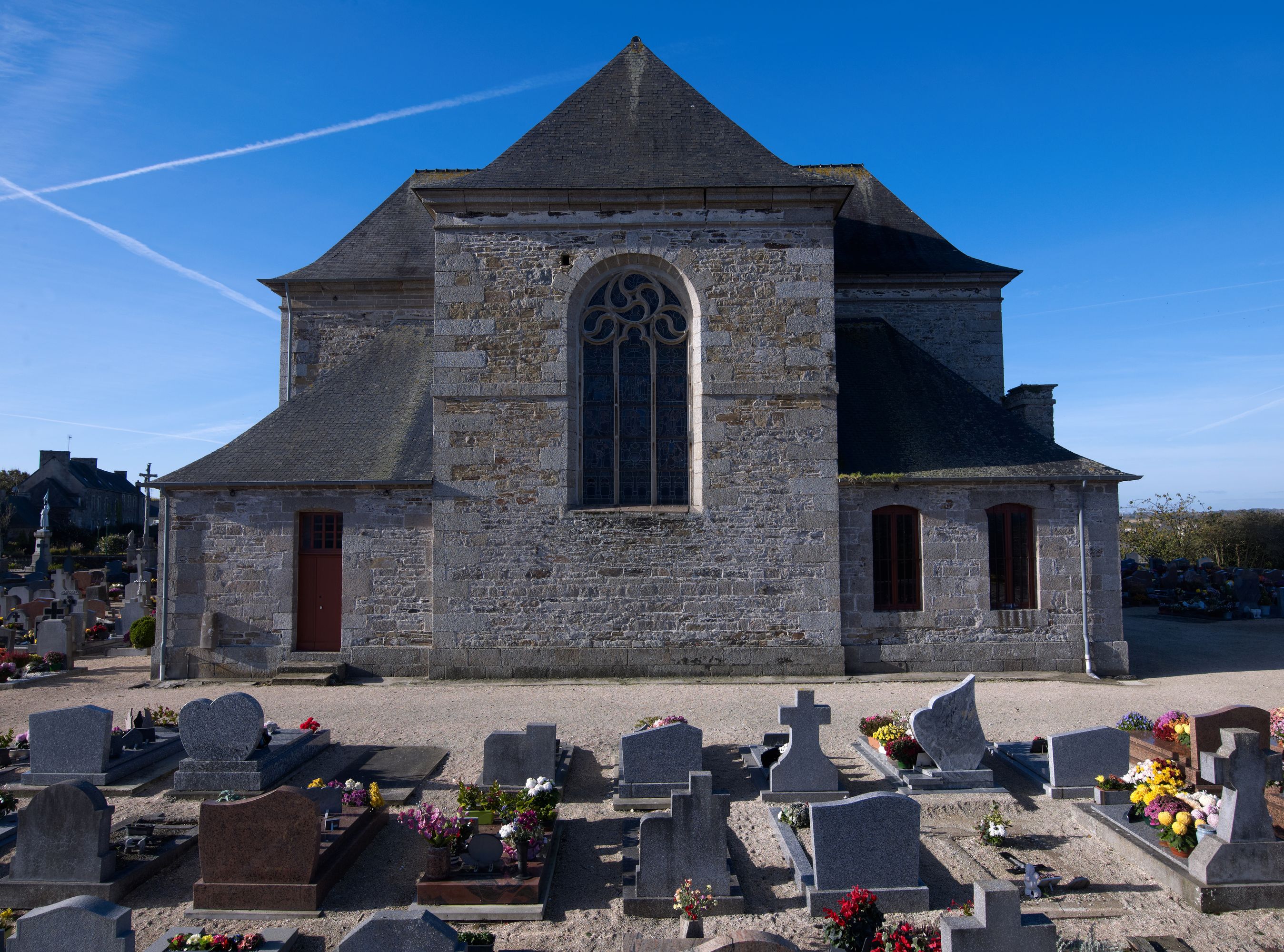 Langoat, le bourg : église paroissiale Sainte-Pompée, chevet, vue générale depuis l'estImmatriculation