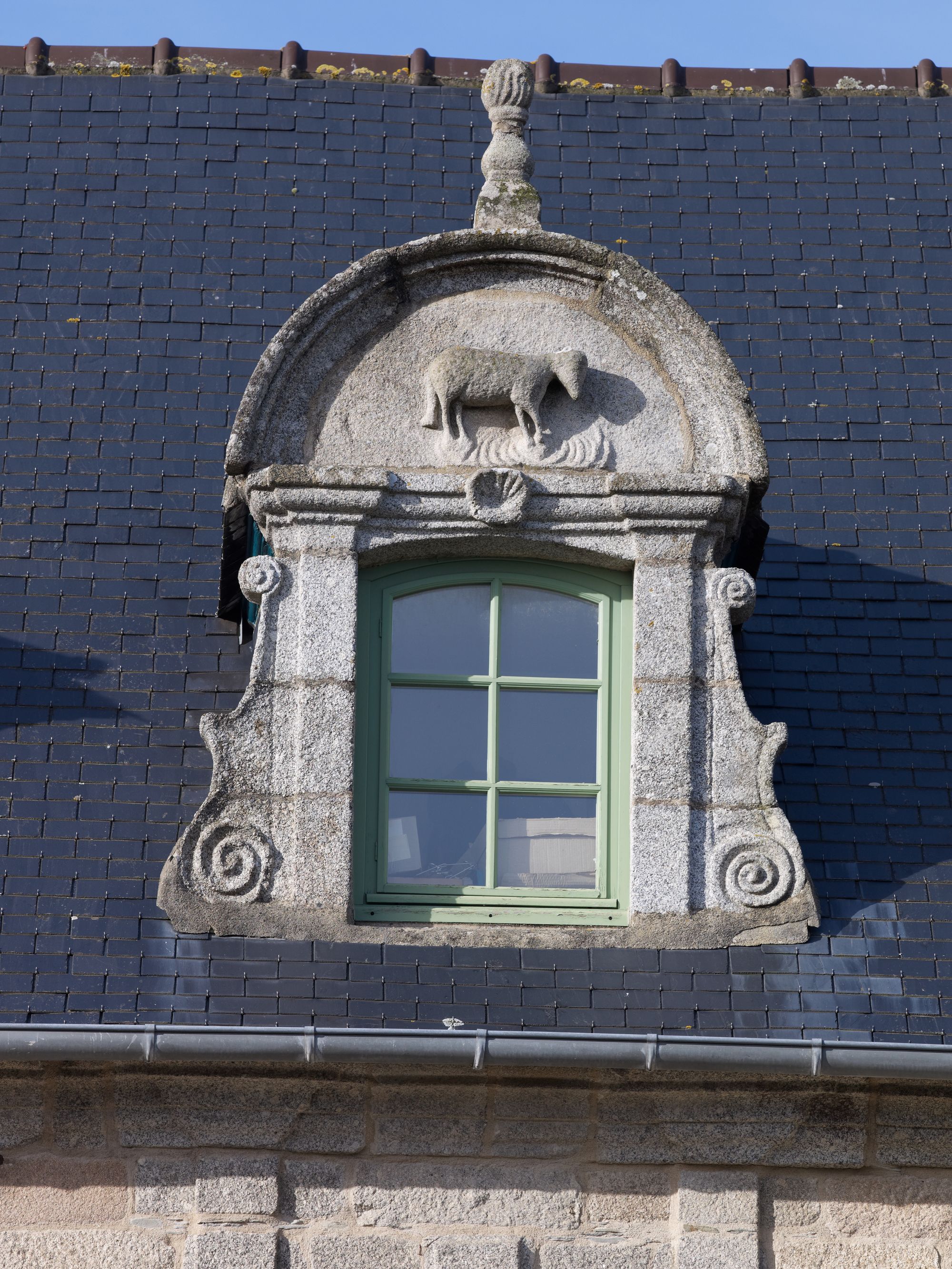 Langoat, le bourg : presbytère, élévation antérieure orientée vers le sud, détail de la travée centrale, lucarne curviligne ornéeImmatriculation