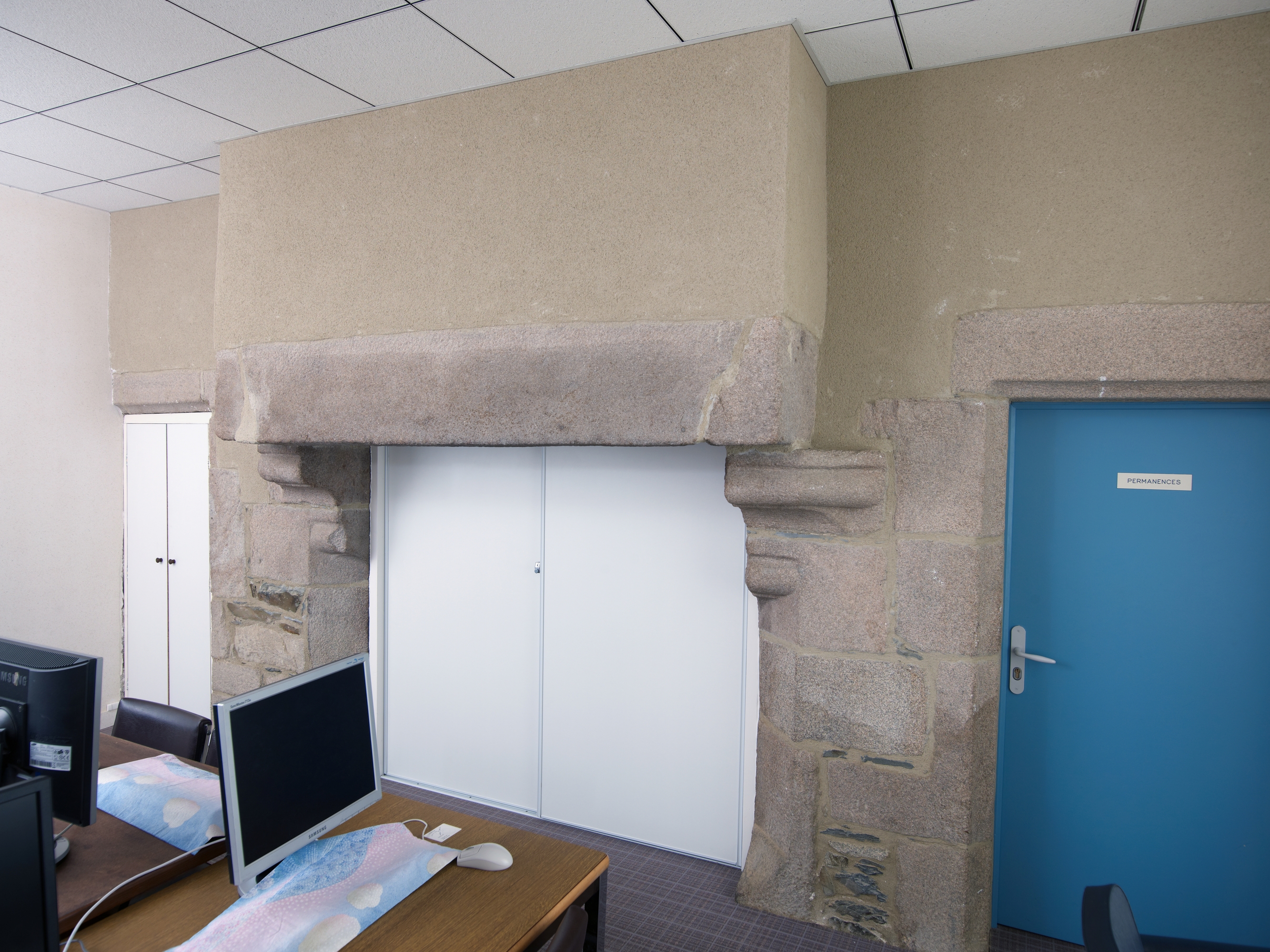 Langoat, le bourg : presbytère, intérieur, cheminée. Il s'agit du bureau d'accueil de la mairieImmatriculation