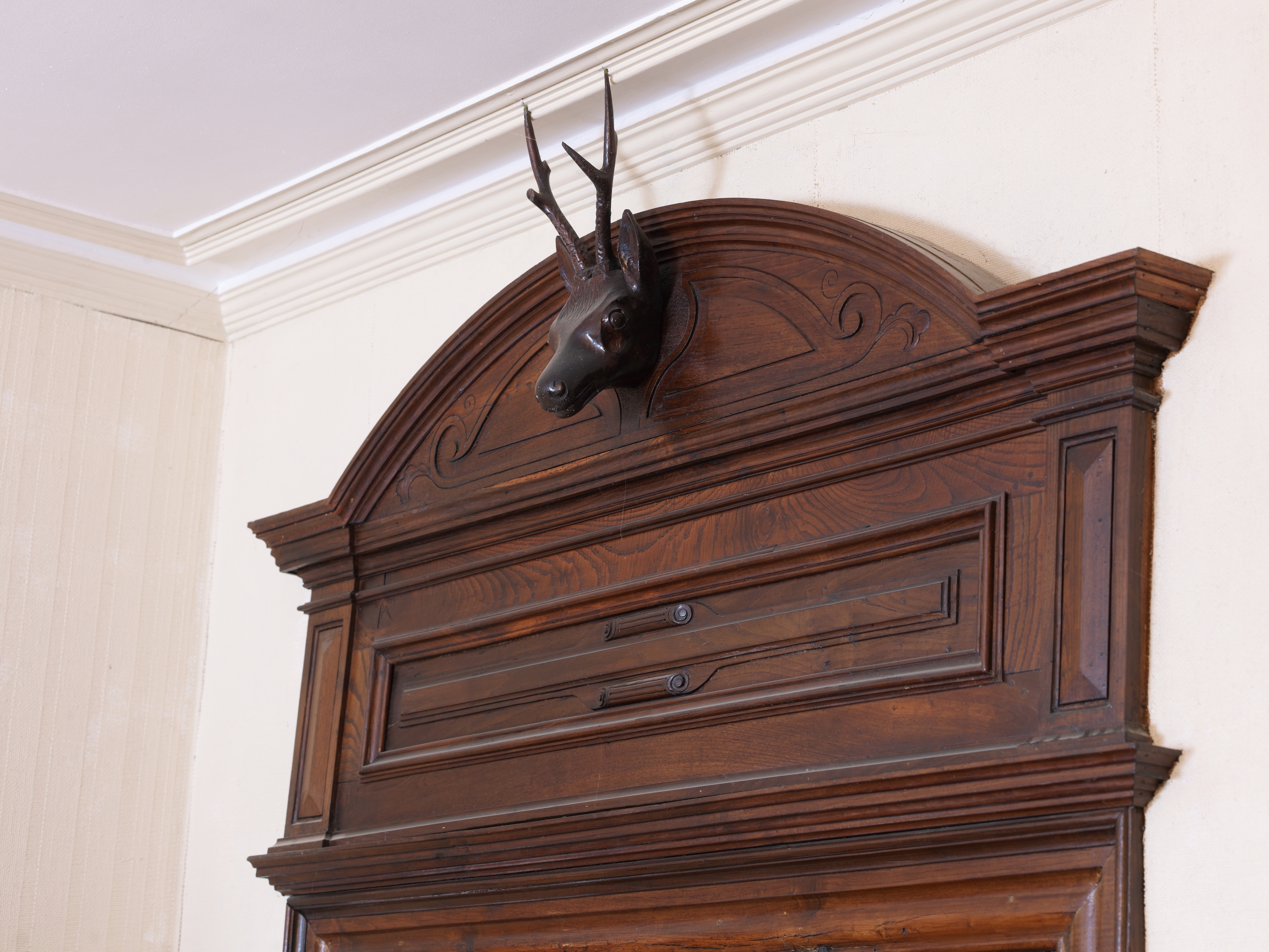 Logis secondaire. Salon. Porte tiercée donnant sur la cuisine. Détail de la tête de cerf en ronde-bosseImmatriculation