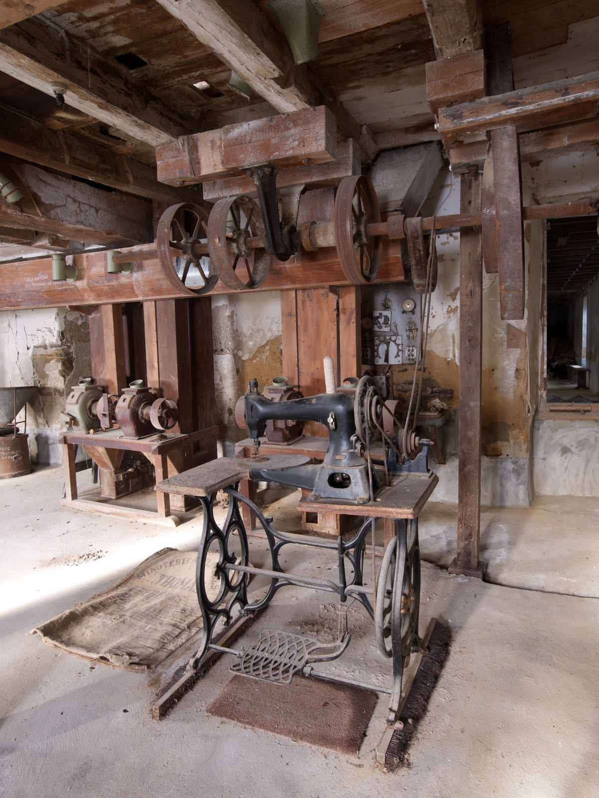 Corps central du moulin. Rez-de-chaussée. Arbre de transmission, vis sans fin, élévateurs vers plansichter n°2 du 3e étage, détacheurs 3, 4, 5, 6 et machine à coudre. Vue généraleImmatriculation
