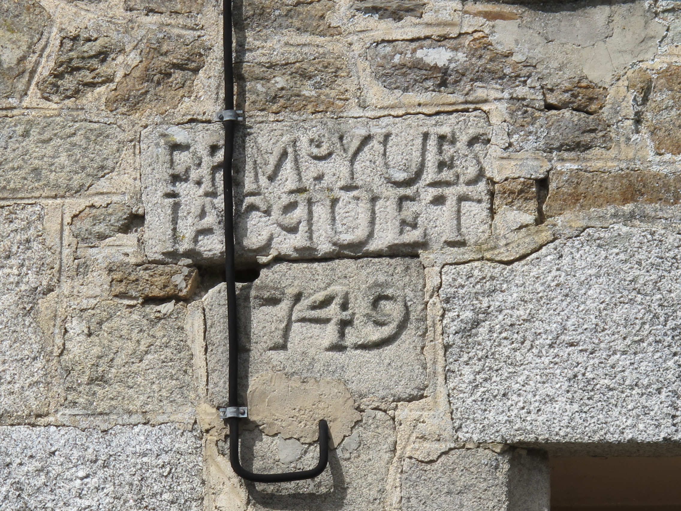Maison ancienne du bourg, remaniée en 1749: F(AIT) P(AR) M(AITRE) ou M(ESSIRE) YVES JACQUET 1749.Immatriculation