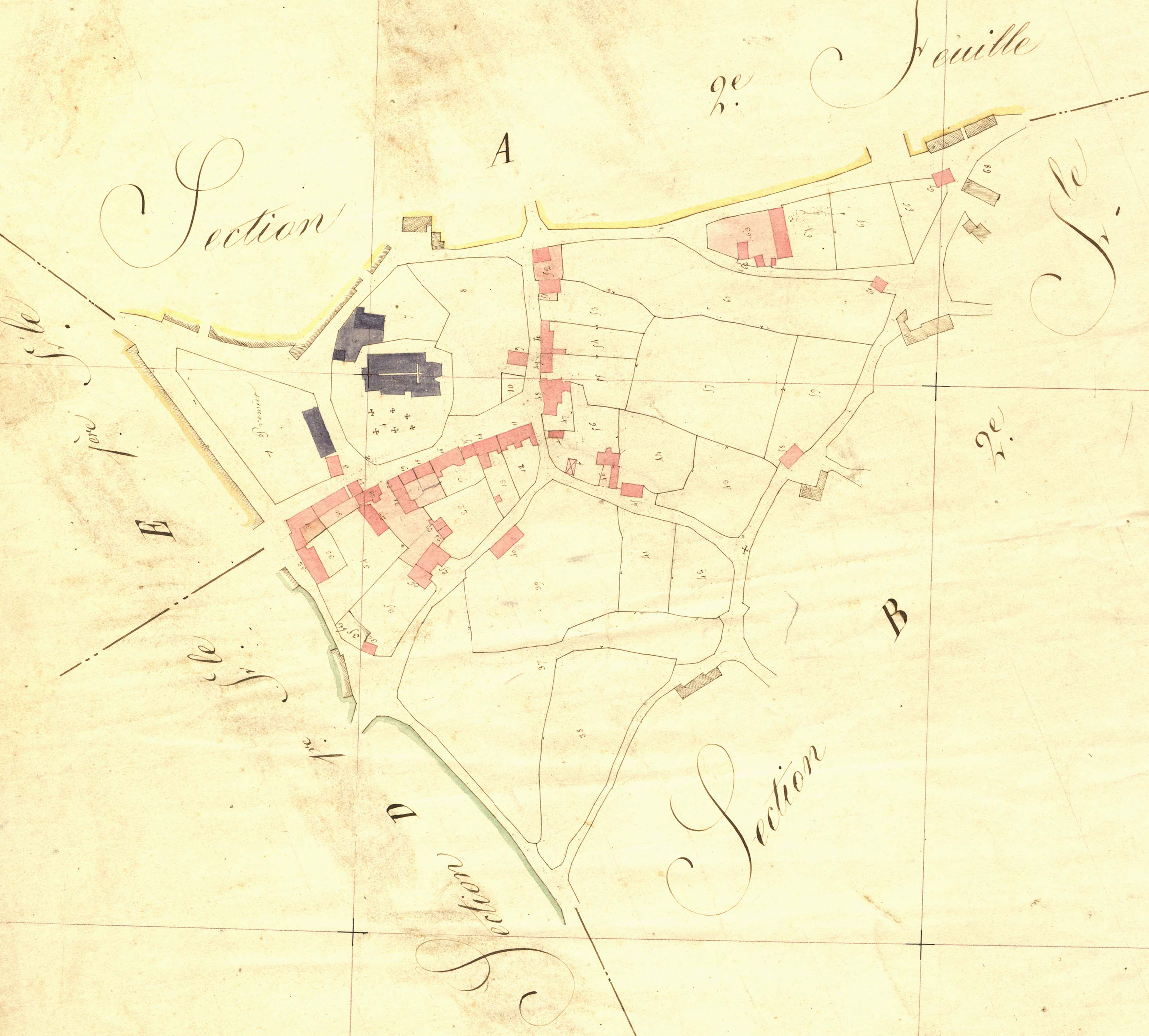 Extrait du cadastre ancien de la commune de Pluzunet, sud du bourg, 1834Immatriculation